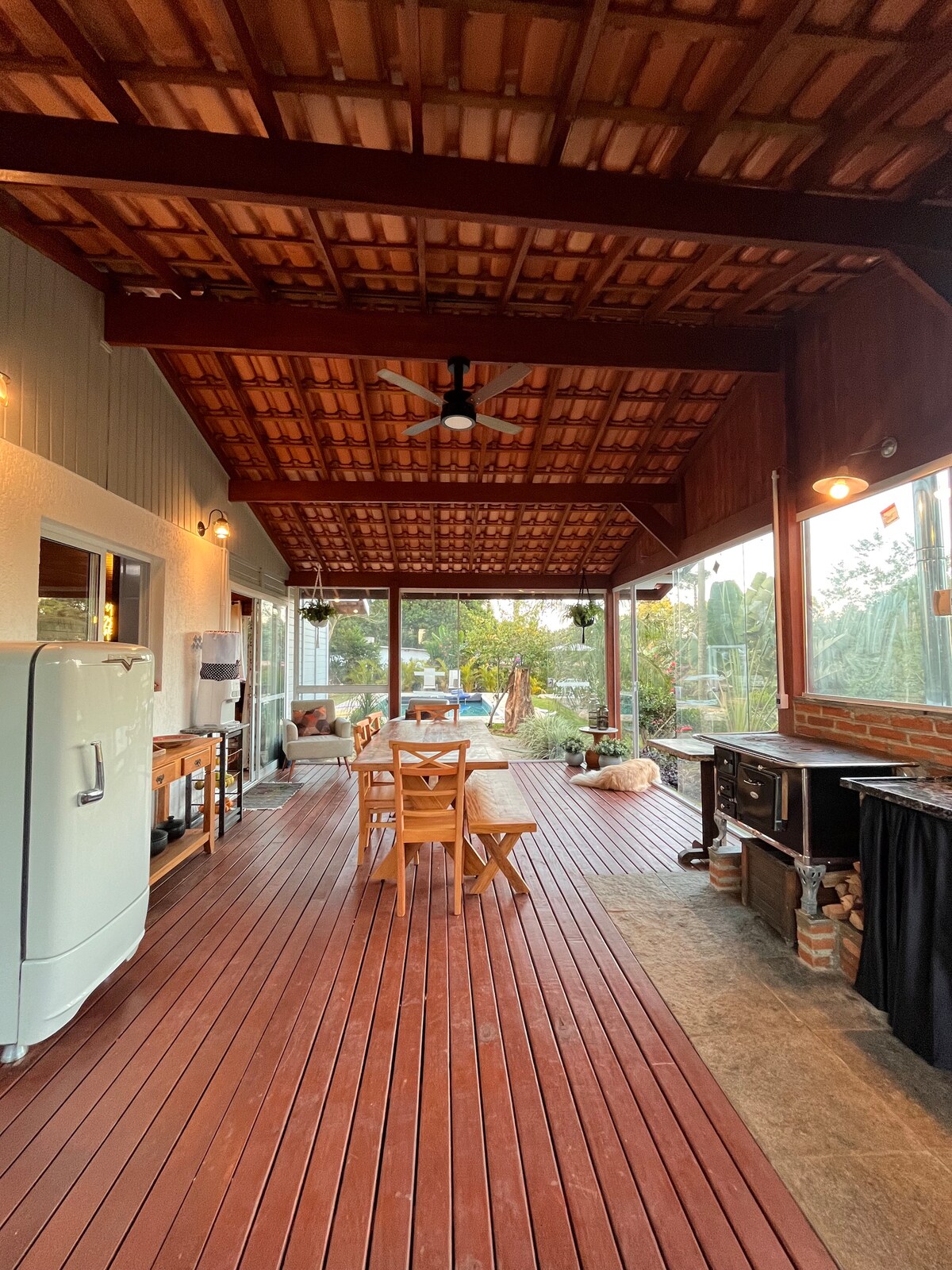 O convite do Chalé Bem-querer é viver momentos de conexão total com a Natureza. Acordar com o canto dos pássaros, sentir a brisa na pele, colher fruta no pé, caminhar descalço pela grama, curtir uma fogueira sob o céu estrelado. • Atividades ao ar livre | slackline, frescobol, trilha na mata, fogueira, jardins, mirante, rede, jogo da velha gigante • Varanda ampla integrada com a natureza e vista para a mata • Farm office | Wi-Fi exclusivo e espaço adequado • Churrasqueira e lareira eco.