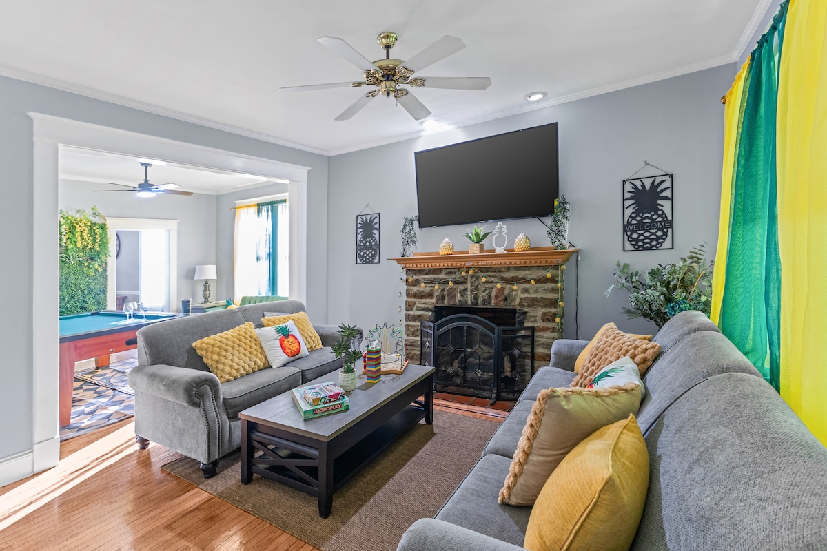 想像一下,您的整個家庭或朋友都在同一屋簷下,享受一間裝飾精美、翻新的房屋,並配備了許多設施。 嗯,不要再想像了! ! ! ! 此房源配備一切– 4張牀( 3張加大雙人牀/1張加大雙人牀) ,配有毛絨牀墊、高端牀上用品和2間浴室、3臺智慧電視、洗衣機/乾衣櫃、開放式起居空間(配有20英尺天花板) ,通往充滿功能和風格的農舍風格廚房,以及超棒的甲板(配有分區沙發)、安裝電視、多功能野餐桌和2個暖氣。