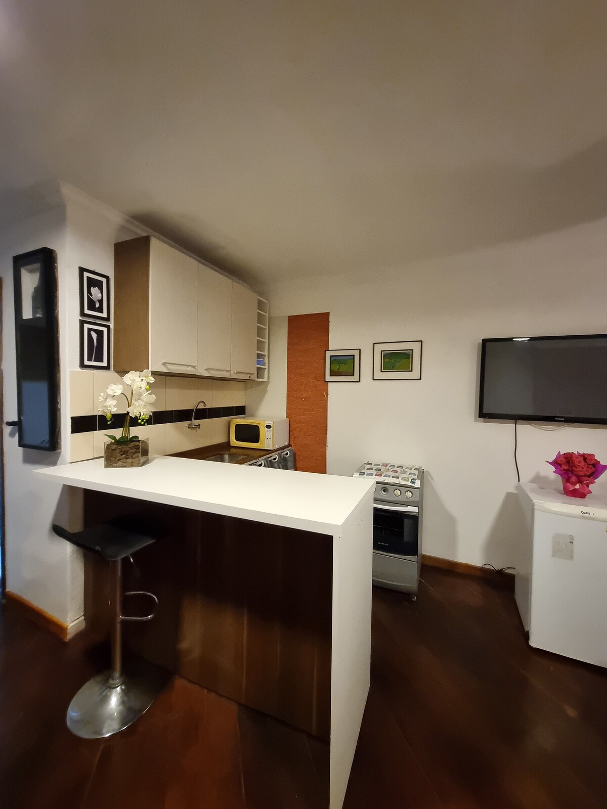 舒適的單間公寓7,理想 適合1或2人入住。光線充足的通風套房,配有陽台舒適的雙人床、廚房 配備微波爐、迷你吧、咖啡機、餐具、Wi-Fi、Netflix智能電視。 安全的外部環境,由攝影機監控。位於Pinhais, Ctba大都會區,靠近Jockey Plaza、Exportrad。前往商店非常方便,非常私密。 非常適合商務差旅、學習或 休閒。舒適實用,地理位置優越!