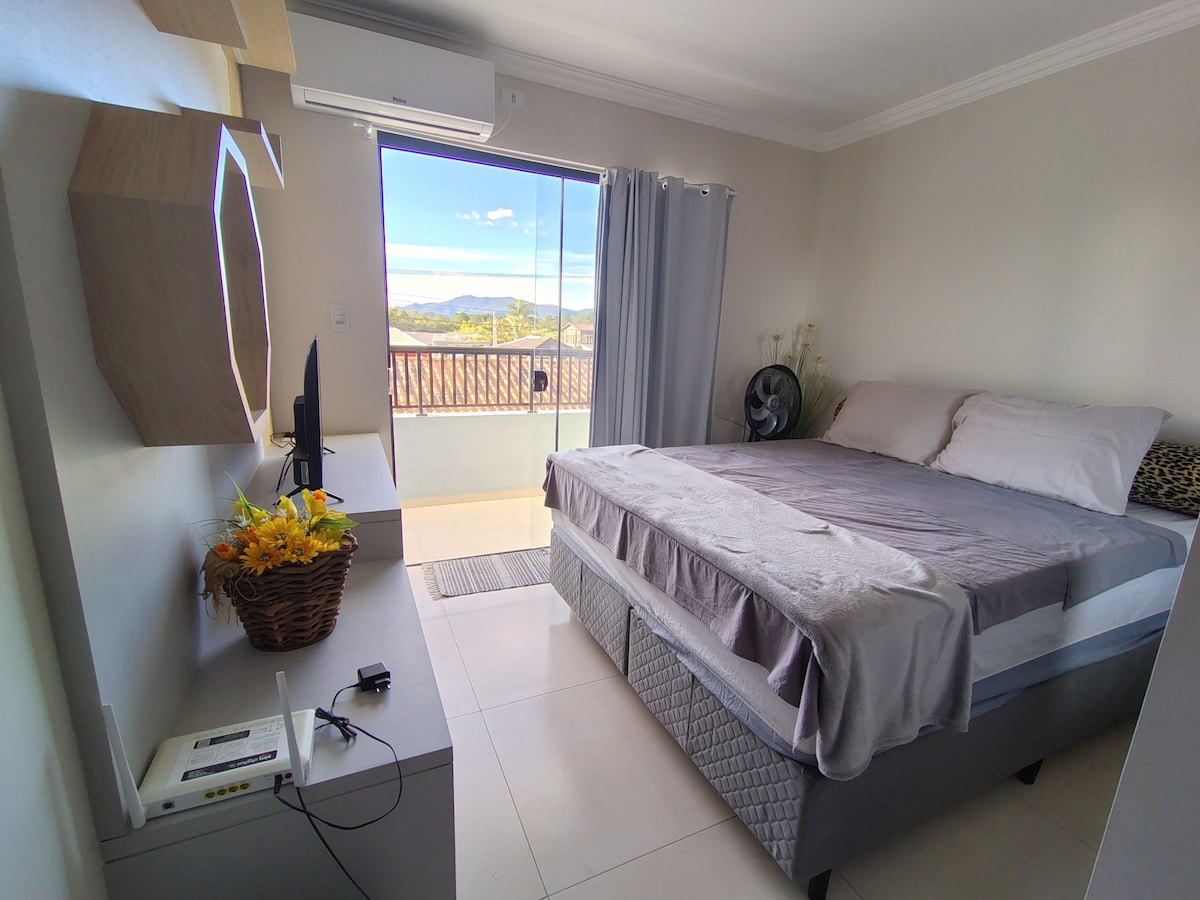 在這個安靜的住宿中與全家人一起放鬆。 新設備: 冰箱、爐灶、電烤箱、微波爐、洗衣機、電視、新床單、風扇和空調。 有車庫。 來看看吧,超級安靜的街區。 靠近公園、商店、購物中心、銀行、服務,並可輕鬆前往主要高速公路和環路。 靠近弗洛里亞諾波利斯的海灘,距離首都和巴士總站不到15分鐘。
