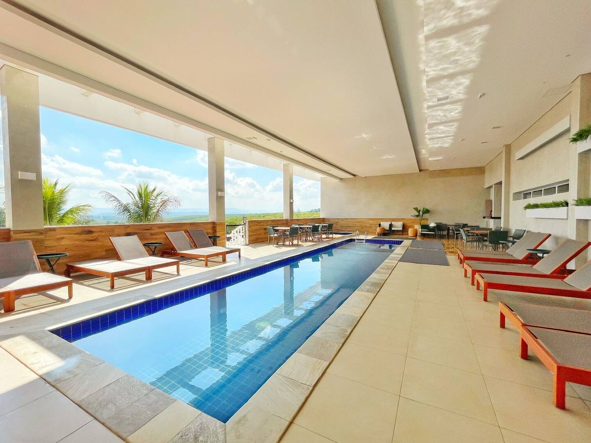 度假村的3樓公寓最多可入住5人,毗鄰拉丁美洲最大的兒童水上公園Thermas Water Park。 享受完整的建築、娛樂、泳池和現場美食。 此空間提供加大雙人牀、沙發牀、迷你吧、空調、牀單和浴室用品,以及令人難以置信的山景。 毗鄰Águas de São Pedro的中心,擁有藥用水、獨特的美食和適合全家人的活動。