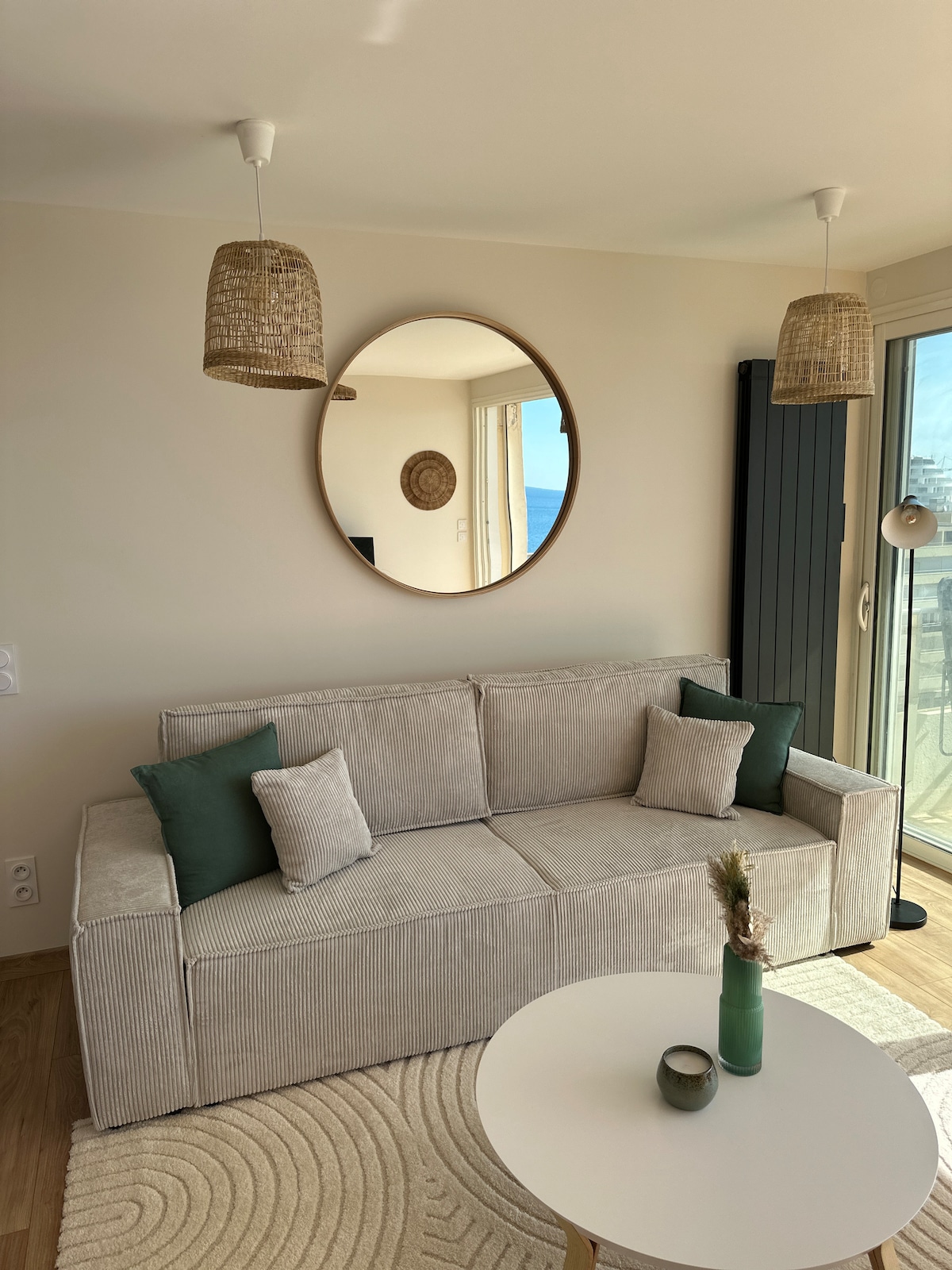 從陽臺、客廳和臥室可欣賞到一覽無遺的海景。地理位置優越:距離海灘 15 公尺,步行 3 分鐘即可抵達市中心。角落公寓,位於二樓和頂樓(無電梯),全面翻新。光纖 WiFi、聯網電視(280 個頻道、可使用 Netflix 訂閱、OQEE 上的免費電影和劇集)、優質床鋪(臥室內有 140 公分寬的床)。洗衣機。私人停車位,大門有保全。可選用床單和毛巾(25歐元)