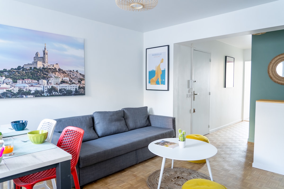 公寓有朝南的露臺,非常舒適、安靜和明亮,設備齊全。 距離紅角海灘( Pointe Rouge beach )及其港口、普拉多海灘( Prado beach )、馬賽維爾山脈( Marseilleveyre massif )、卡朗格( calanques )僅一步之遙,您會在這裡找到一個安靜的地方,適合您的家庭度假。 公寓靠近橙色賽車場,乘坐地鐵巴士前往市中心( 45分鐘)。步行15分鐘即可抵達舊港口和季節性的海上穿梭巴士。 附近有許多商店和餐廳