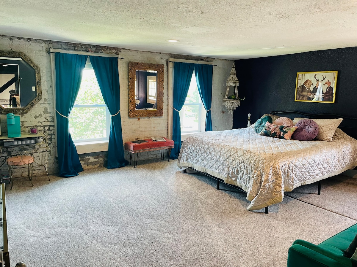這間大房間設有露臺、兩人木製浴缸和獨立玻璃淋浴間。 它位於我們古樸的葡萄酒吧二樓,可俯瞰密蘇里河。距離我們歷史悠久的市中心河濱社區僅幾步之遙,有很多酒吧、餐廳和迷人的商店可供探索。