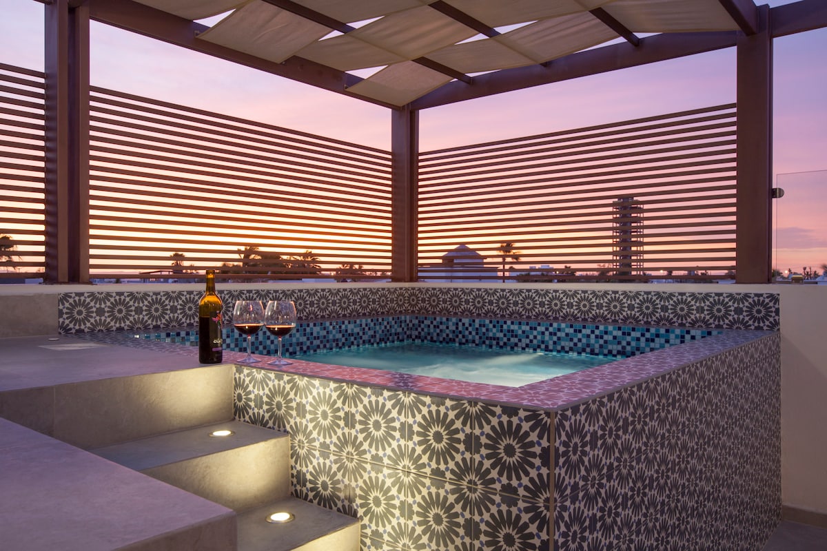 Romantica vista atardecer terraza privada y tina