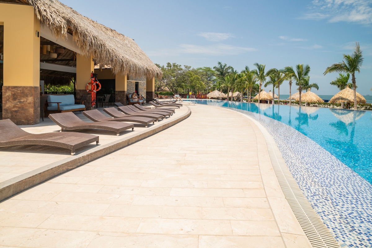 Despierta con la brisa del mar y camina por un sendero iluminado hasta una playa privada a solo 20 metgros del hermoso mar azul. Disfruta más de 21 jacuzzis, piscinas infinitas, gimnasio, sauna, turco y jaula de golf. El restaurante con la mejor comida local directamente en la puerta del apartamento o servicio a la playa. A solo 10 minutos del aeropuerto, este espacio nuevo te ofrece confort, vista al mar y momentos inolvidables en Santa Marta con tu familia o amigos.