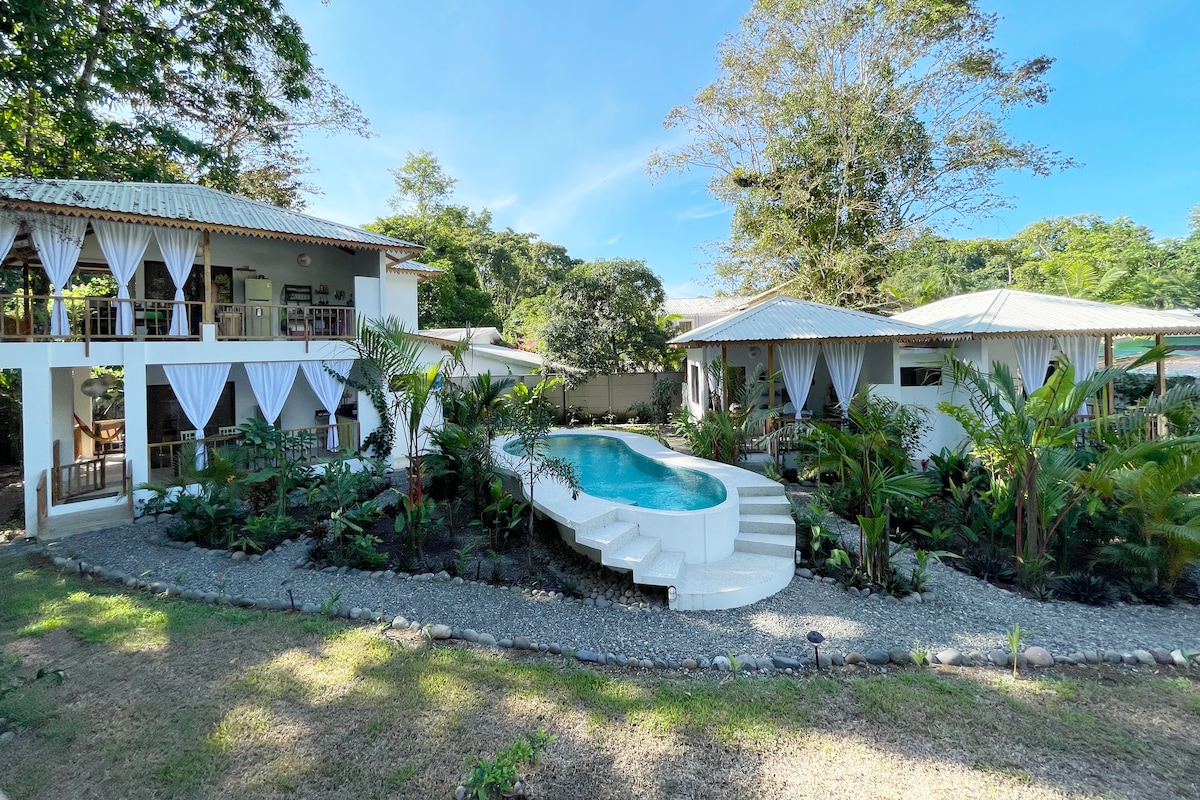 美麗的2人生態平房,配有露臺、吊牀、吊牀、WiFi、WiFi、空調、空調、熱水和設備齊全的廚房,小房源內有茂密的熱帶花園內,設有遊泳池。 *步行5分鐘即可抵達Playa Chiquita海灘,距離老港市中心12分鐘車程。 *遮陽停車位加上兩個充電端口( 220和110V ) !