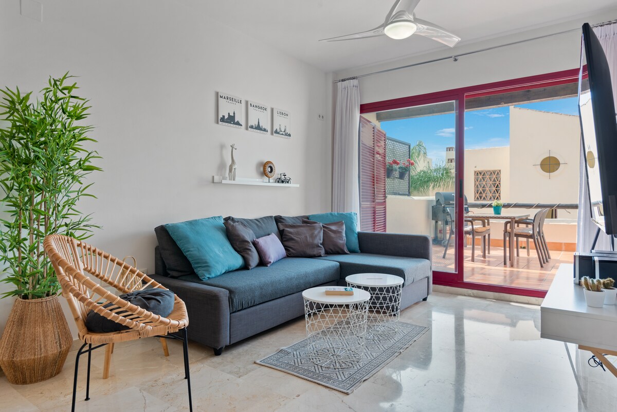 歡迎來到我們明亮舒適的兩層波希米亞風格頂層公寓,位於寧靜的Jardines de Casares城市化區域—一個被大自然包圍的安靜區域,距離海灘僅幾步之遙。 這間旅居設有兩個寬敞的露台,可欣賞全景海景和山景,非常適合放鬆身心、在戶外用餐或在完全私密的環境中享受陽光明媚的早晨。