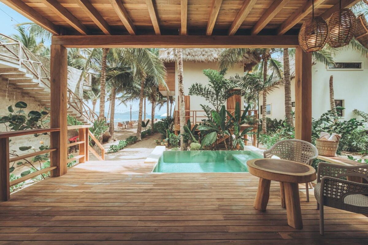 享受我們的珊瑚海灘平房,直接在沙灘上。 採用天然材料設計,提供1間特大床臥室、1張特大沙發床和2間浴室。 廚房和客廳通向露台和木製甲板,設有私人溫水泳池,可俯瞰大海。 別墅於2024年12月竣工,全新。 旅人還可以使用共用無邊際泳池,泳池中有吊床和棕櫚樹下的沙灘傘。 一個輕鬆、安靜的地方,享受墨西哥海岸。