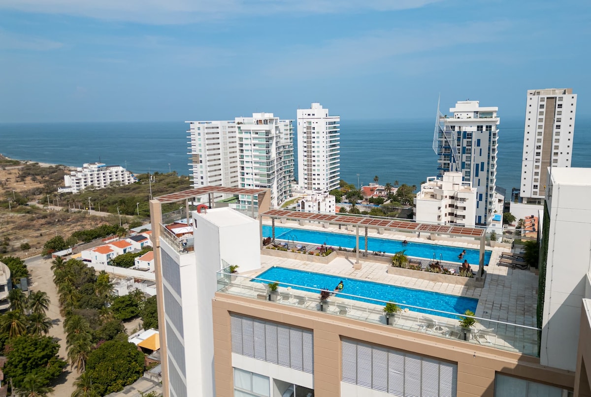 享受位於 Rodadero 優惠區的豪華公寓,距離西蒙·玻利瓦爾國際機場僅 15 分鐘,步行 10 分鐘即可抵達 Rodadero,設有私人海灘出口、海灘俱樂部、綠地區域和生態步道、全景露臺和濕地區(按摩浴缸、酒吧、多個成人和兒童泳池),以及其他設施,如微型足球場、健身房、乒乓球等,讓您盡情享受。