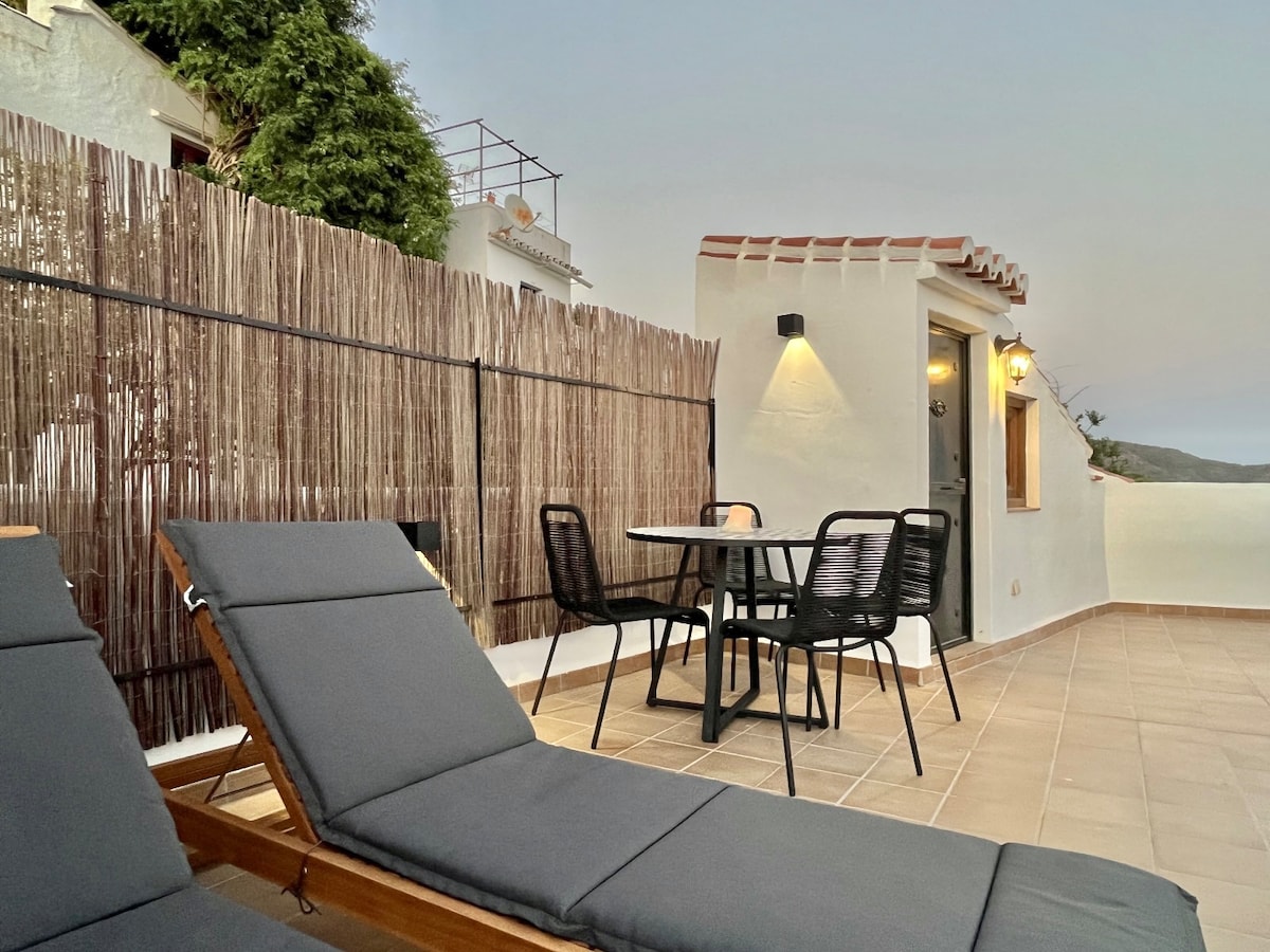 The new renovated ancient house is situated in the old part of Frigiliana in one of the most charming streets near the panaroma point of the village. The house offers a spacious living with sofa and chair. From here you go the to sleepingroom with a 4 poster bed (160*200). In the well equiped kichten you find the dining table. The bathroom with walk- in shower, toilet and sinck. The garden with private pool (May 2025) and roofterrace offers amazing seevieuws. BBQ, dining table and loungechairs.
