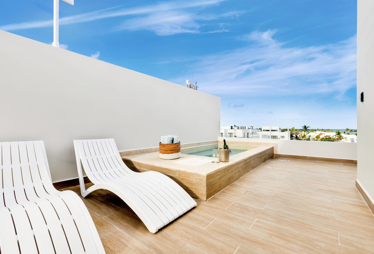 這間豪華的3層頂層公寓設有1,000平方英尺的屋頂露台,可欣賞全景海景,只需40步即可抵達巴瓦羅海灘! 享受私人加熱按摩浴缸、瀑布、日光浴床、躺椅、用餐區、烤架和洗手盆,四周環繞著熱帶棕櫚樹。 位於Los Corales的中心,步行5分鐘即可抵達商店、餐廳、酒吧和超市。 門禁社區, 24小時保安。