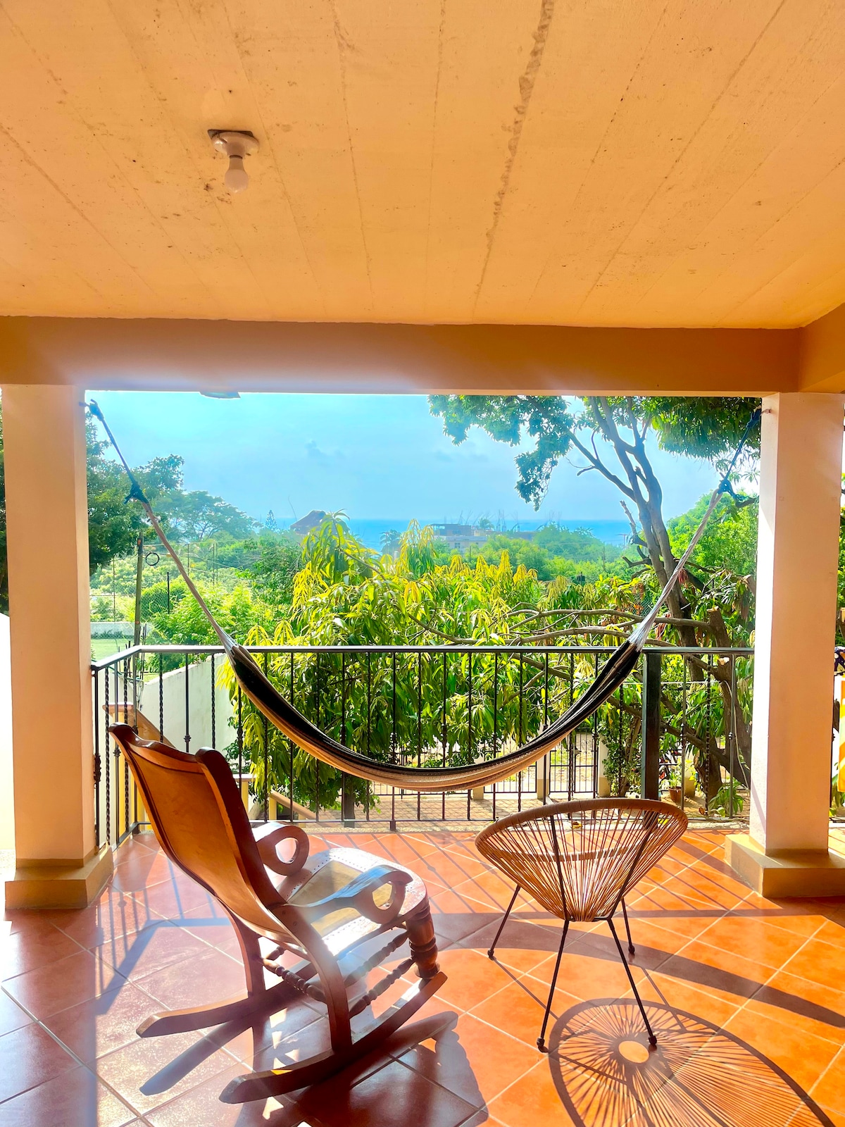 Depa amplio y luminoso en planta alta con 2 camas queen súper cómodas, A/C en la recámara y ventiladores en sala y cocina. Cuenta con cocina equipada, salita acogedora y balcón con vista a palmeras. Estás a solo 2 min de la playa y a 1 min de cafés, tiendas y restaurantes. Disfruta el patio compartido con hamacas, árboles frutales, asador y área de pesas artesanales. Ideal para relajarte, surfear o trabajar remoto con buena vibra.