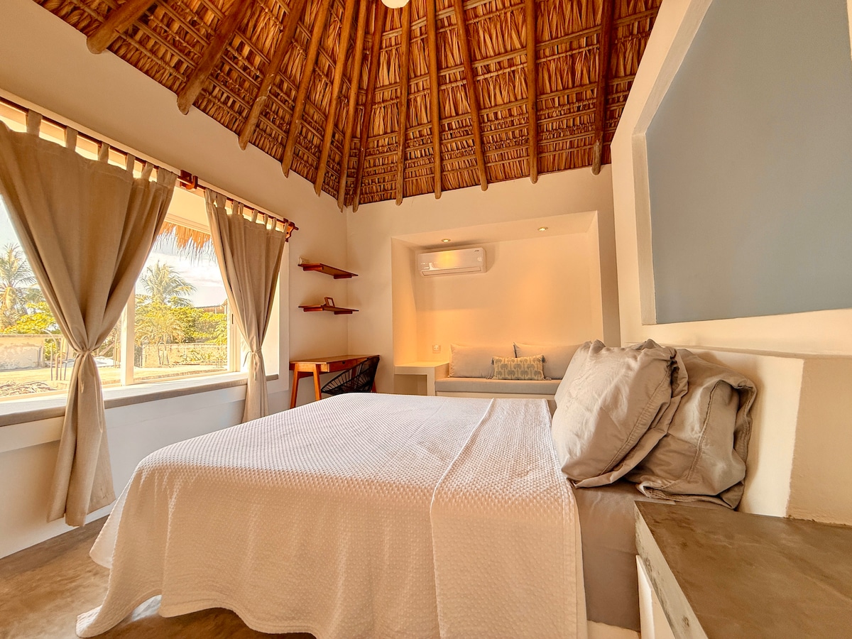 探索二樓的寧靜,可欣賞海景的加大雙人牀套房。 享受舒適的加大雙人牀,配有高品質的牀單、獨立浴室、迷你冰箱和空調。 使用吊牀踏上露臺,欣賞泳池和海景。 步行5分鐘即可抵達Playa Zicatela和新市場。 *舒適的加大雙人牀、高級牀單 *獨立衛浴 *清爽泳池、戶外家具 *迷你冰箱 *空調、WiFi、電視 *寬敞的衣櫃 *配有吊牀的休閒露臺 *擁抱當地parota木材優雅