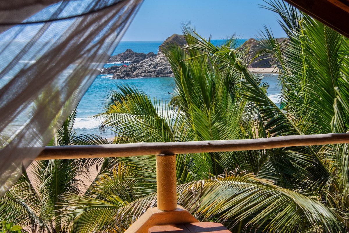 Perched on the third floor, The Nest is Océano's most breathtaking retreat — where the Pacific pounds the shore below and sweeping ocean views stretch endlessly from your private terrace. Two bedrooms, a kitchenette for morning coffee and fresh market finds, and the most dramatic sound of waves in the house. Fall asleep above the sea and wake up to the horizon. The Oaxaca Coast at its most unforgettable.