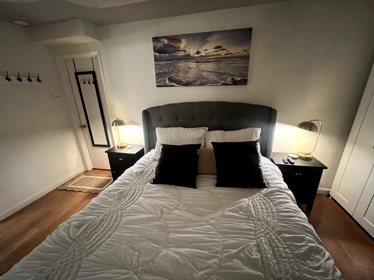 獨立舒適的1間臥室/1間浴室小平房。這個空間擁有拉丁美洲海灘、西班牙瓷磚地板和木製家具的風味。小廚房配有電磁爐和超大烤箱(無爐灶)、全尺寸冰箱、私人露臺座位、遮陽傘、熱帶植物。配有小淋浴間的浴室。 臥室有窗簾,配有全套衣櫃、雙人床。客廳有沙發床/沙發,配有雙人床墊,可供第三位房客使用。請在預訂前閱讀「其他注意事項」。