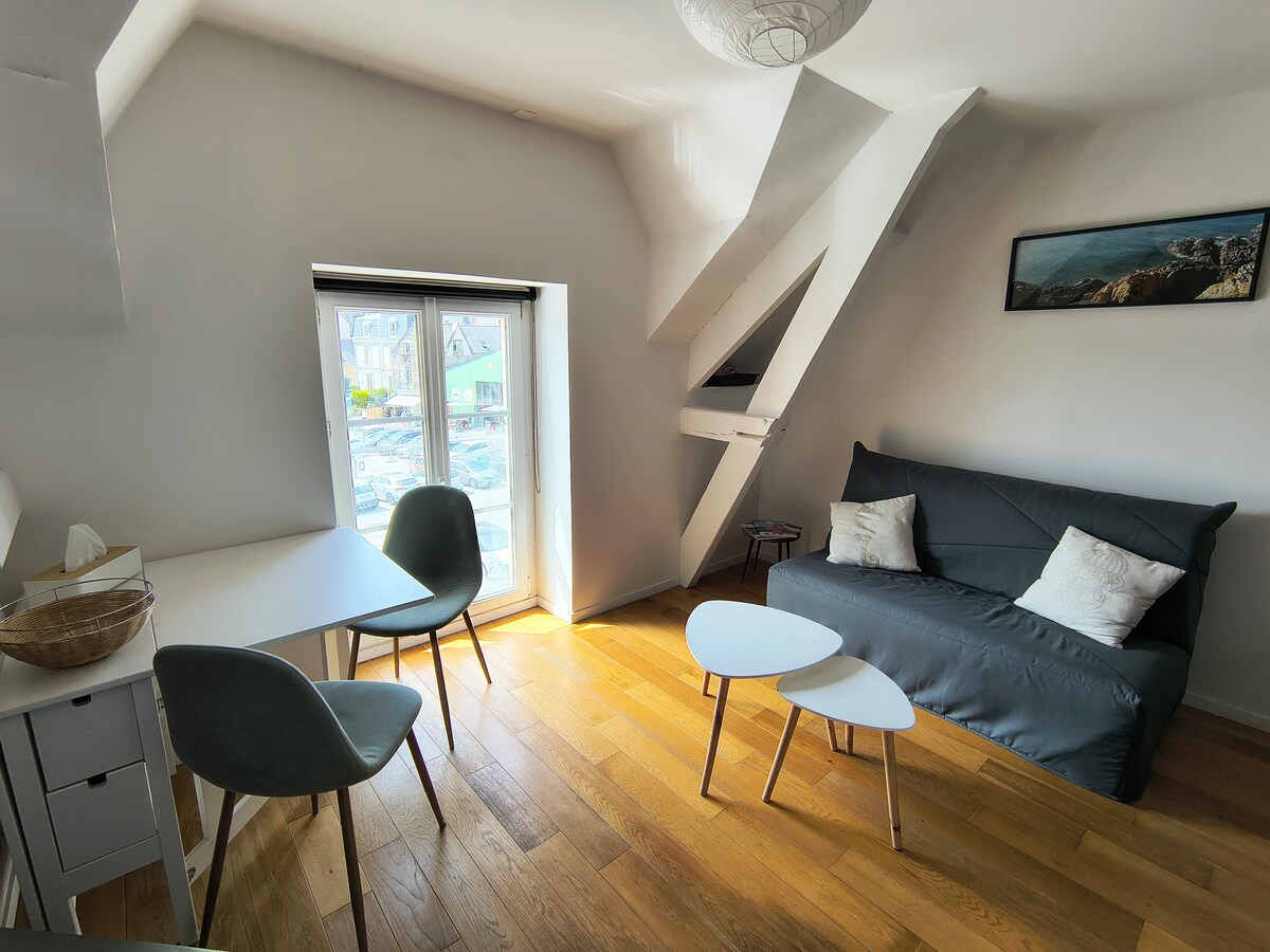 我們很高興歡迎您來到我們位於Val André市中心的公寓。 公寓明亮,面積為35平方公尺,客廳配有優質沙發牀(真正的彈簧牀和牀墊) ,以及配有雙人牀的臥室。 臥室和客廳一側的海景。 設備齊全的廚房是獨立的。 超過2晚的住宿會提供床單。 附近有所有商店+免費泊車 可從Lamballe火車站乘坐的士