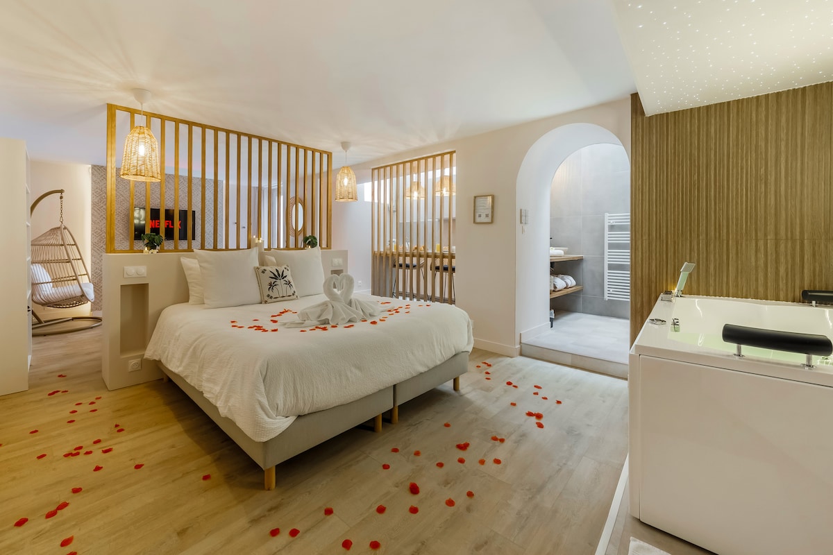 高端住宿,配有Balneo、桑拿、密宗沙發、秘密門,可揭示帶桑拿和按摩桌的私人水療中心。 在這間美麗的66平方米巴厘島風格的房源中,讓自己享受放鬆的假期。 所有舒適設施: •套房配有加大雙人牀( 180x200 )、高級寢具 •星空雙人浴缸 •配有按摩床和桑拿的秘密房間 •客廳配有蒸汽壁爐和智能電視 •配有雙人淋浴間的浴室 • 唐卡扶手椅