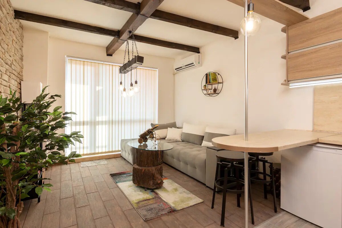 Our charming apartment is located in the heart of the city and similarly to the rhythm of the town mixes modern furnishing in a calm and relaxing atmosphere. The flat is on a 5 minutes walking distance from the main pedestrian street, the central garden and the old town. The area offers a variety of shops, markets, restaurants and bars. We aim that our guests enjoy home comfort during their stay and experience Plovdiv at its best.