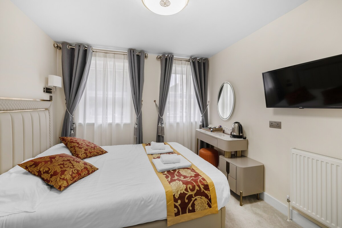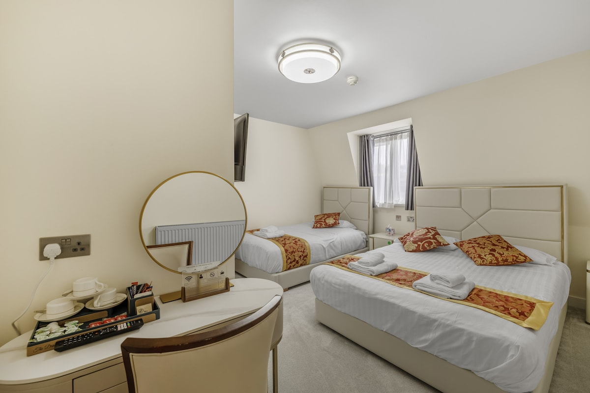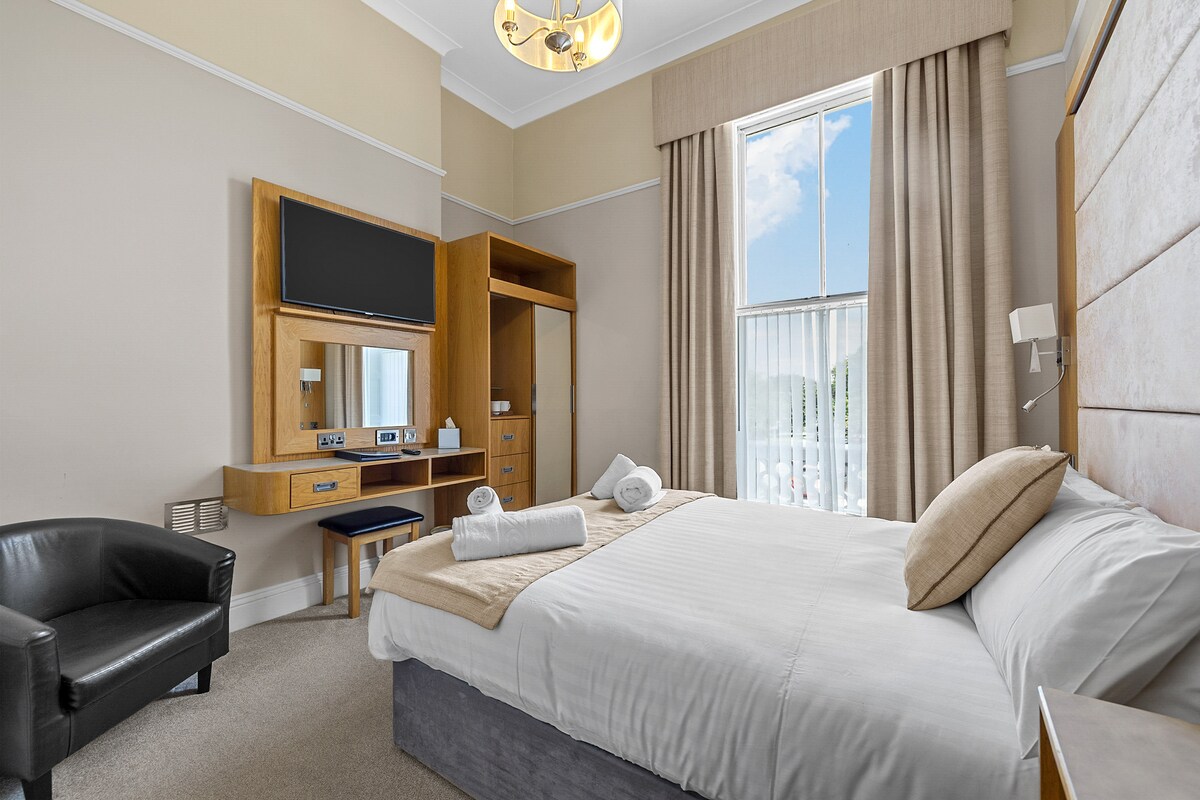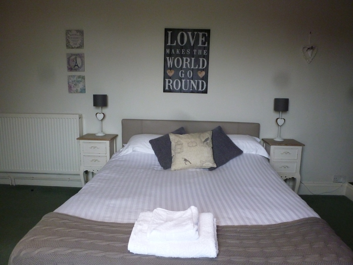 更大的臥室、舒適的加大雙人床、套房浴室。窗戶、客人可使用樓梯。 雪櫃、茶/咖啡設施。風扇、暖氣。 電視、WiFi。我們接受行為良好的狗,費用為每晚12英鎊,在預訂時支付。 兒童只接受預約,每晚收費。 請在預訂前確認。 客廳提供免費早餐,包括麥片、羊角面包、水果和咖啡。 樓下咖啡館/酒吧的單點烹飪早餐,從9點到5點