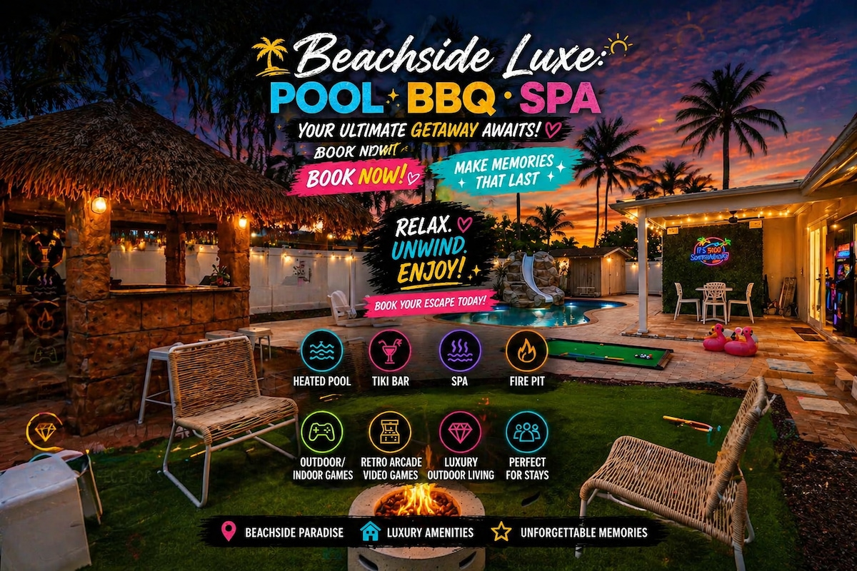 -大型溫水泳池,適合所有人使用的漂浮物和設備與服務 -熱水浴缸非常適合寒冷的夜晚 -冰桶400可恢復和冷卻 - 引體向上和下壓訓練架 - 推桿果嶺 -放鬆身心的火坑 -吊牀 -可供4名玩家使用的N64 -咖啡吧 -唱片機 -電動車/特斯拉充電器, 48W - 丙烷燒烤和備有食材的廚房! -開車7分鐘即可抵達海灘! -輕鬆入住- 6名成人和4名兒童 沒有,您有機會為任何尋找勞德代爾堡最佳的團體預訂完美的度假勝地!