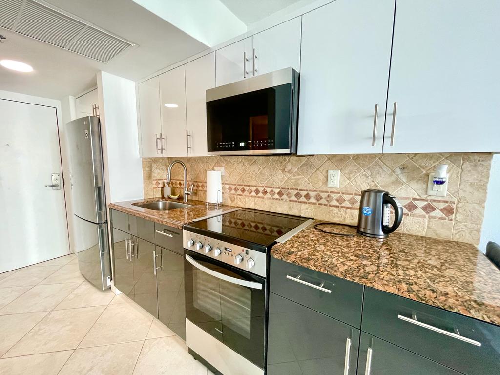 Fully furnished 1 bed/1 bath condo in the heart of Sunny Isles Beach, with washer/dryer inside, kitchen, balcony, tall windows and OCEAN view from living and bedroom. Enjoy your stay with a 24 hr valet service, room service, as well as the use of the spa, fitness center, restaurant, pool and beachside service, bar, and concierge services. It's a perfect way to have worry-free beachfront vacation with 1st class amenities. * Condo located in the hotel and guests pay resort fee (aprox $45/day)