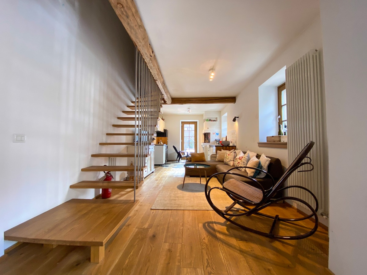 45平方米的明亮舒適公寓,配有獨立入口和大露臺。 公寓內有一間雙人臥室和一間配有雙人沙發床的客廳。配有設備齊全的小廚房,以及早餐必需品:麵包、果醬、咖啡、茶和布里歐,可在室內或大露臺上享用。 浴室配有淋浴。 可俯瞰大型私人花園,與Green Cottage的任何客人共用。配有空調。