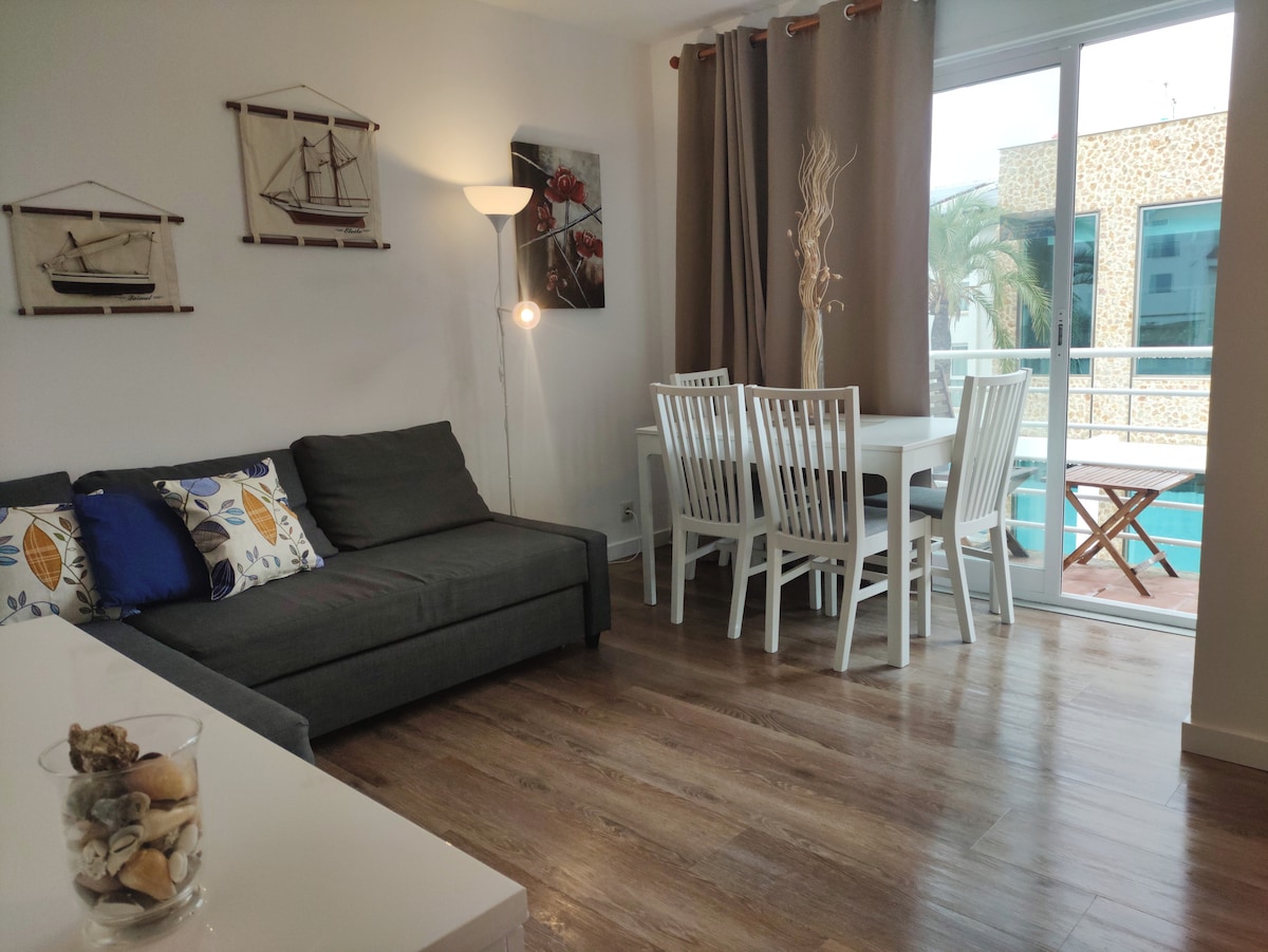 翻新的公寓,位於四樓(有電梯),距離海灘 100 公尺。寬敞的客廳,配有開放式廚房,配備電磁爐、洗碗機、烤箱/微波爐、冰箱。客廳有一個美式吧台、一扇面向大海的窗戶、55吋LG電視、Astra衛星、空調、Wi-Fi和一張沙發床。露臺可俯瞰社區泳池。 臥室配有雙人床或兩張單人床。浴室配有淋浴間、馬桶和吹風機。 客廳配有雙層玻璃窗。