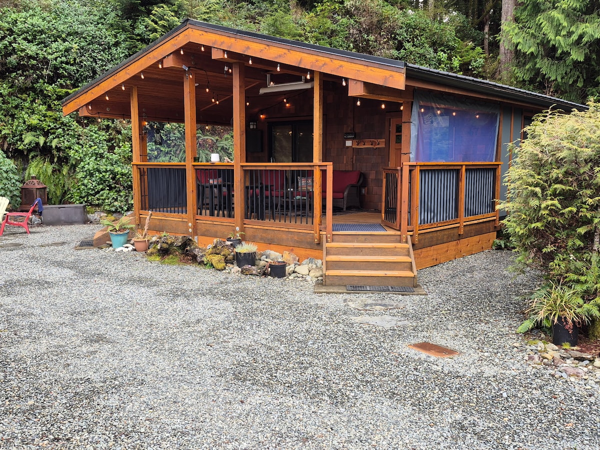 這間僻靜的小屋可供4人入住,配有全新的私人有蓋熱水浴缸、丙烷火坑、有蓋燃氣燒烤、一間臥室,以及一張標準雙人沙發牀、設備齊全的廚房、燃氣加熱器和可欣賞壯麗海景、山景和森林景觀的大露臺。 我們靠近阿凡達格羅夫( Avatar Grove ) ,在那裡您可以欣賞加拿大最矮的樹,以及植物園海灘( Botanical Beach )和帕希達海灘( Pacheedaht Beach )。 享受大自然的美麗和倫弗魯港周圍的一切。 非常適合前往天堂的「遠離塵囂」!