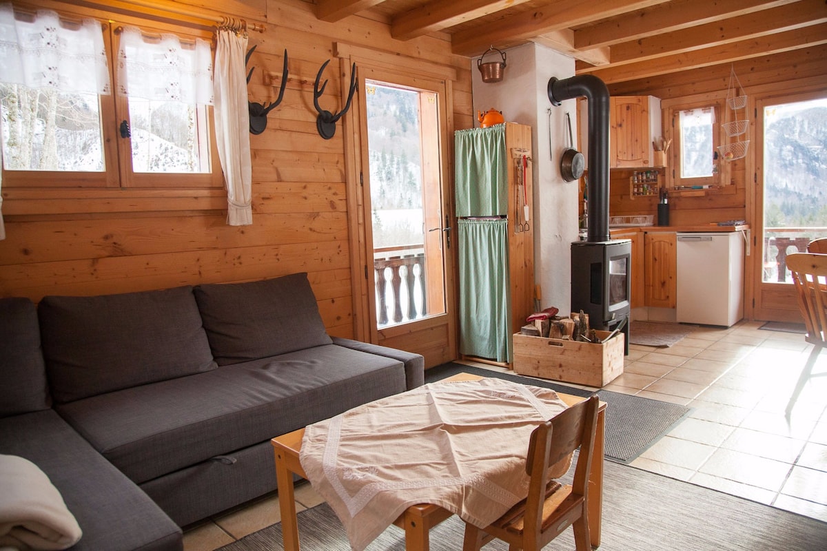 我們明亮舒適的小木屋坐落在森林和河流之上,位於一個安靜的區域,距離大自然、河流、徒步道起點僅幾步之遙,距離穿梭巴士(冬季運行)3分鐘 在壁爐旁或按摩浴缸中放鬆身心的理想閣樓。 非常適合情侶入住。 可應要求提供 2 人以上的住宿。 它有一間臥室(2 人)和 1 個夾層下的開放空間,配有電視和舒適的沙發床。