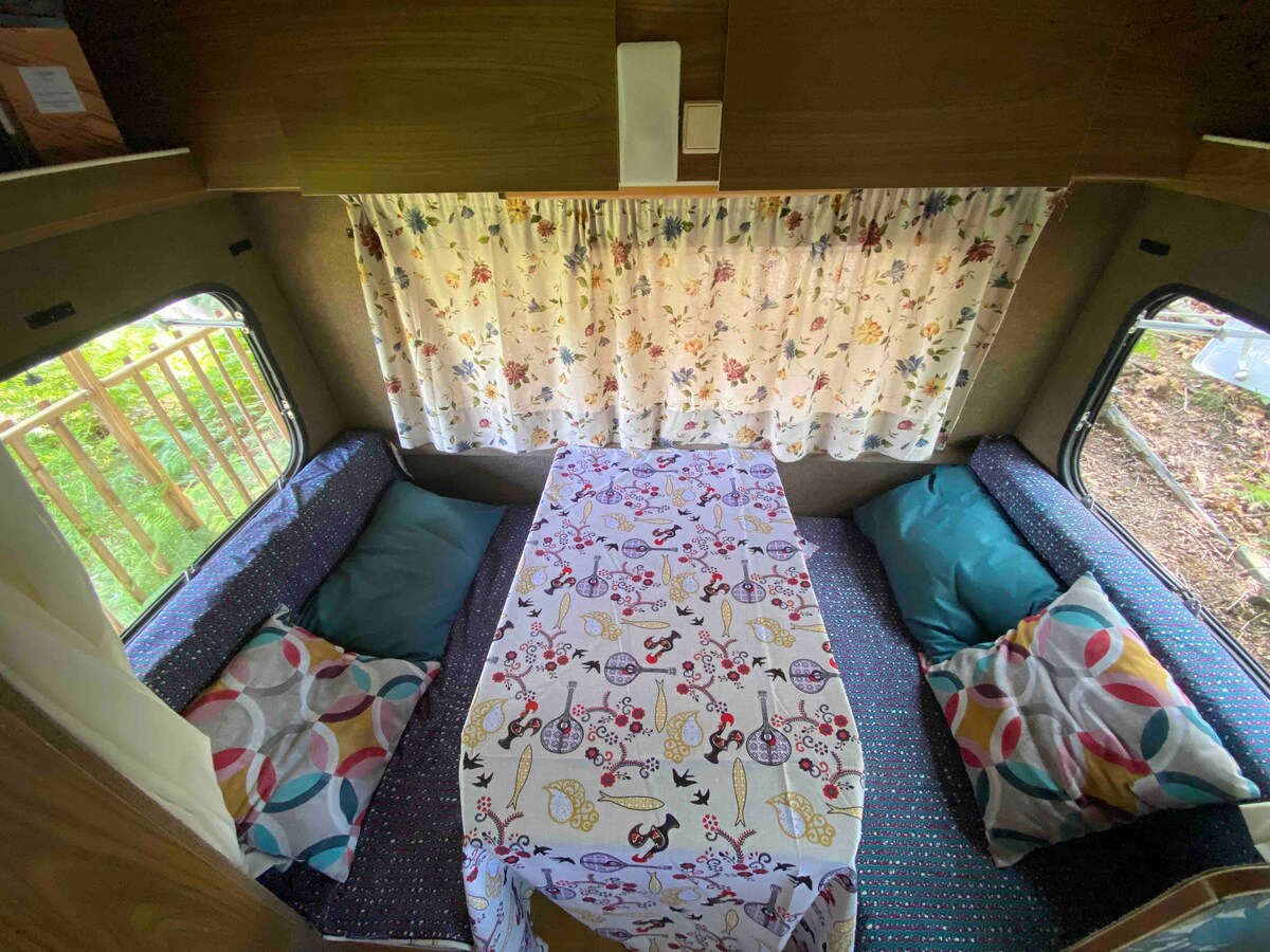 Caravana equipada, avançado de sombra generosa, espaço de refeição exterior. Integrada no terreno de plantação de tremoço doce, perto do armazém. Por perto, em Requeixo, açude para banhos de rio, com sombra de carvalho para picnic, e pastéis de bacalhau. A nossa quinta, perto, com animais livres, patos, gansos, ovelhas churras do minho, produtos biológicos, sumo de maçã. Praias fluviais em Fermil, Quintela e Borba. O nosso moinho também perto, para banhos. *Wifi, se aparelho disponivel.