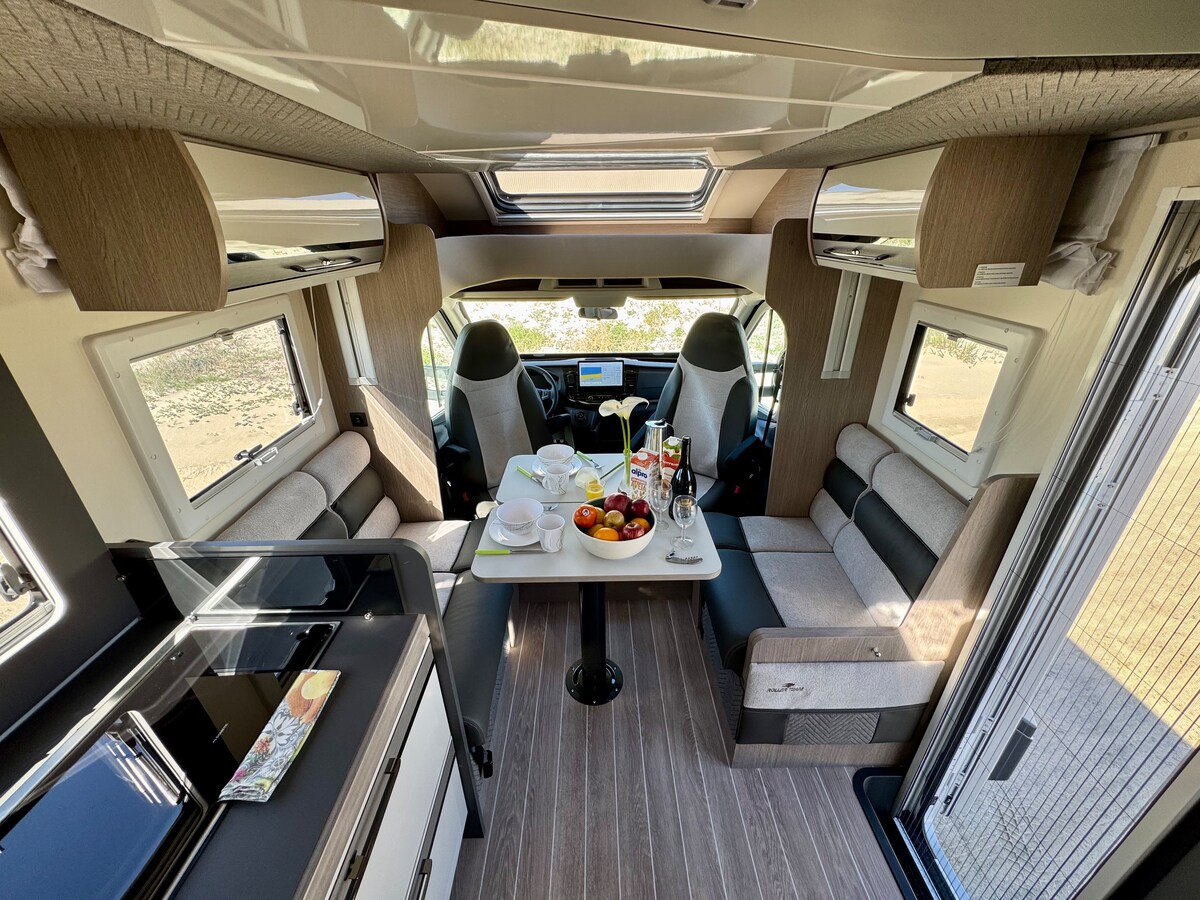 Caroline from Caravanconcierge company is a modern and spacious motorhome of german construction, with a double bed always open and bunk beds, plus a double bed that is assembled with the table and sofas. It offers ample space for a large family. Comfortable for a family or friends trip, up to 6 people. With all amenities. PLEASE TAKE IN CONSIDERATION IF YOU WANT TO TRAVEL #% EUROS PER DAY IS NEEDED TO PAY INSURANCE.