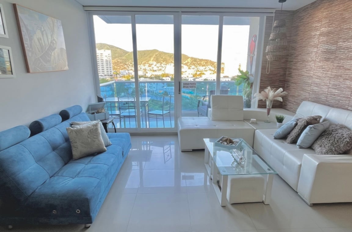 Espectacular apartamento en planta 6 con vista al mar. Sus 73 mts cuadrados están decorados en un estilo moderno y acogedor. Situado delante de la Marina Internacional y a 3 minutos caminando del parque de los novios. Cuenta con 2 balcones para disfrutar del los increíbles atardeceres de Santa Marta, nuestros huéspedes tienen acceso a las lujosas instalaciones del hotel Marriot, sus dos piscinas con vistas al mar, restaurante, Bar y servicio de masajes. cuenta con dos ascensores