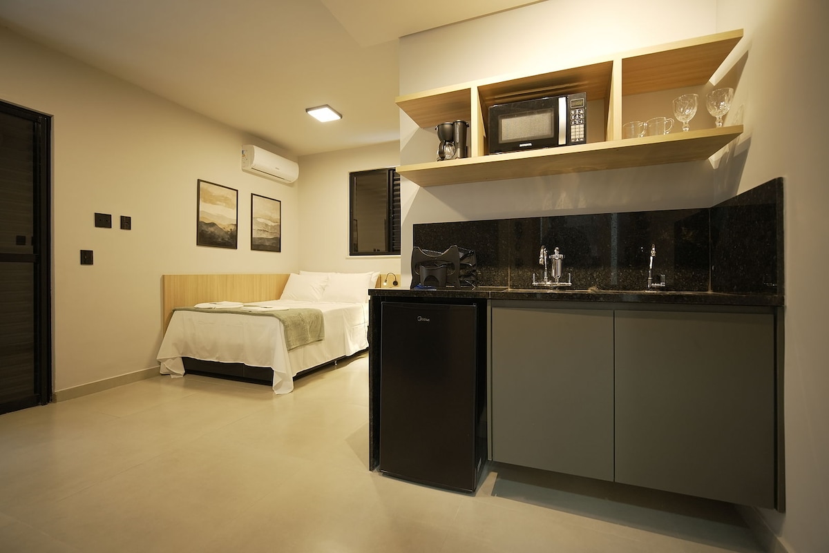 Super cozy and functional space in the center of Belo Horizonte. Designed with a modern style and the warm hospitality that only a home in Minas Gerais can offer! 🏠 Integrated space with: ➤ Queen-size bed with 300-thread-count sheets and a spacious, comfortable sofa bed. ➤ Air conditioning, total blackout curtains, and a spacious desk. ➤ Bathroom with hair dryer, practical and fully equipped kitchen, and washing machine. ➤ Electronic door lock, television, and Wi-Fi.