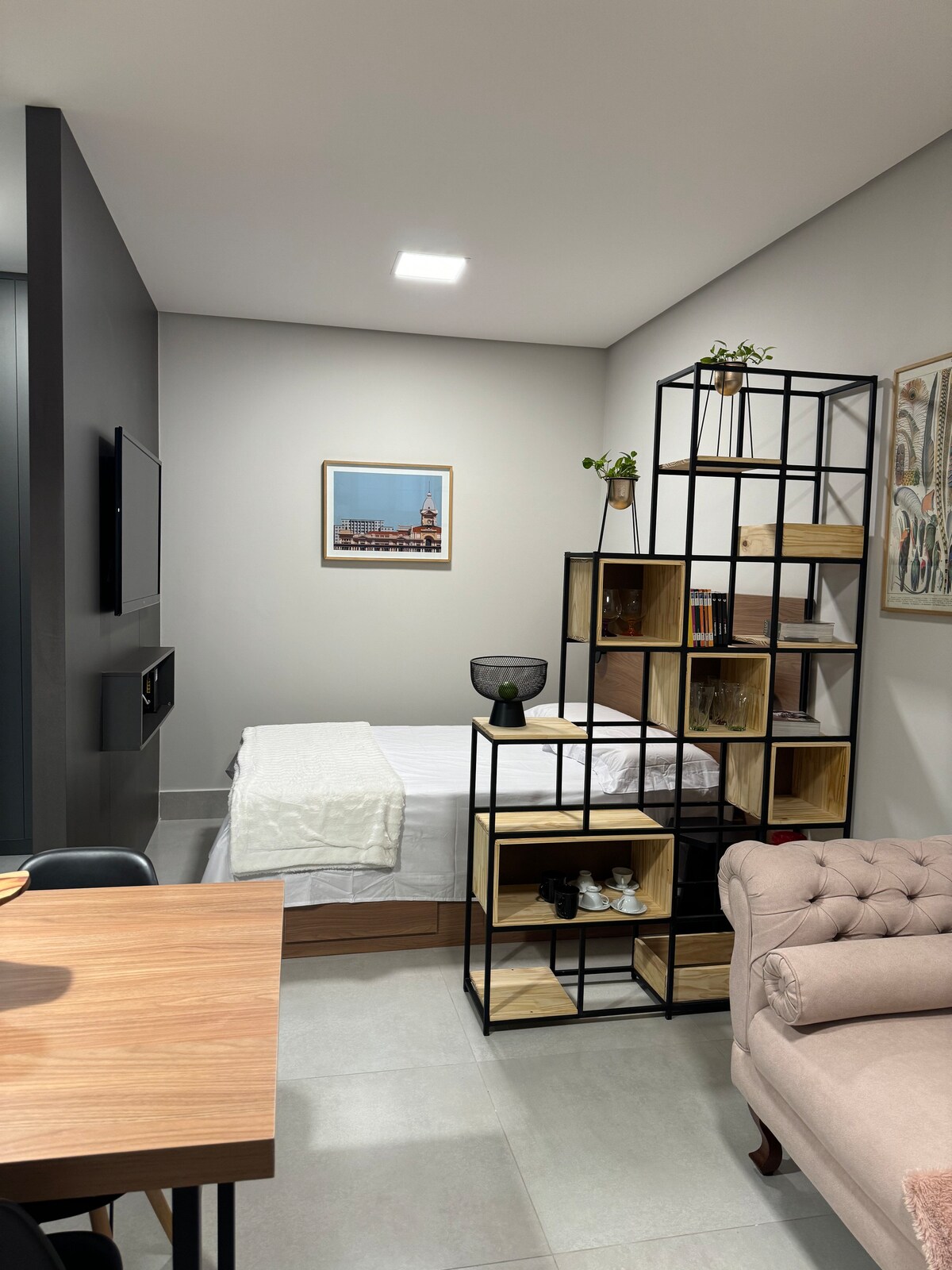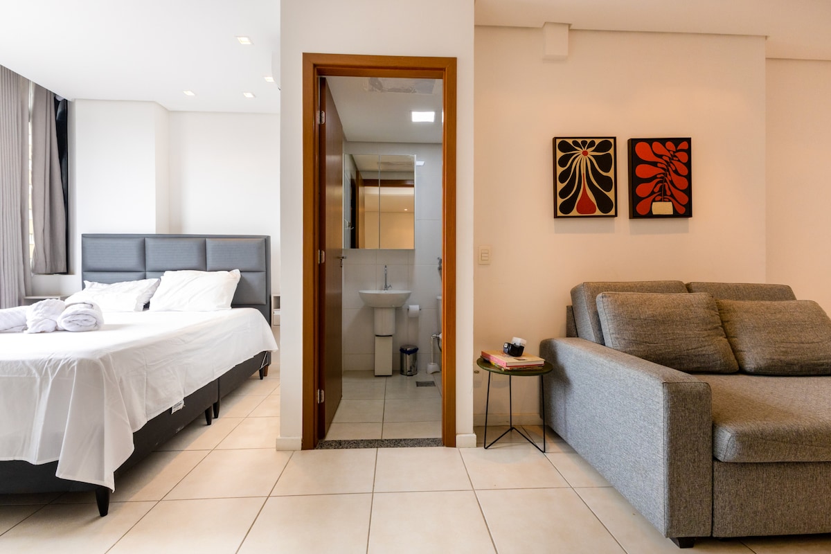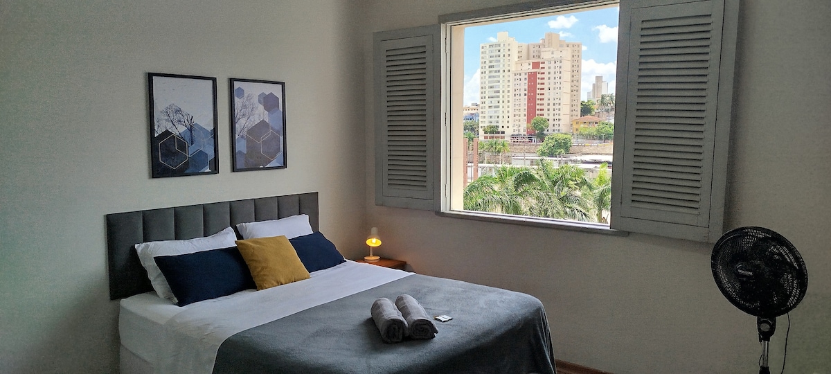 Super cozy and functional space in the center of Belo Horizonte. Designed with a modern style and the warm hospitality that only a home in Minas Gerais can offer! 🏠 Integrated space with: ➤ Queen-size bed with 300-thread-count sheets and a spacious, comfortable sofa bed. ➤ Air conditioning, total blackout curtains, and a spacious desk. ➤ Bathroom with hair dryer, practical and fully equipped kitchen, and washing machine. ➤ Electronic door lock, television, and Wi-Fi.