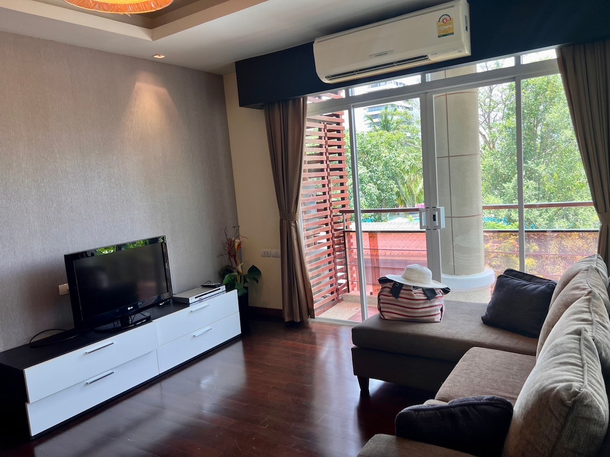 在這個安靜的地方放鬆身心,有兩個大泳池和滑梯。 位於僻靜的海灘中,靠近餐廳、購物和水上主題公園。 公寓是配備廚房設施的雙臥室。 大型私人室外露臺,配有充氣按摩浴缸。 其布局包括一張加大雙人牀、空調、衣櫃。 大型50英寸智慧電視、WIFI、蘋果電視、Netflix、鏡像功能、冰箱、吹風機、微波爐、爐具和廚具。
