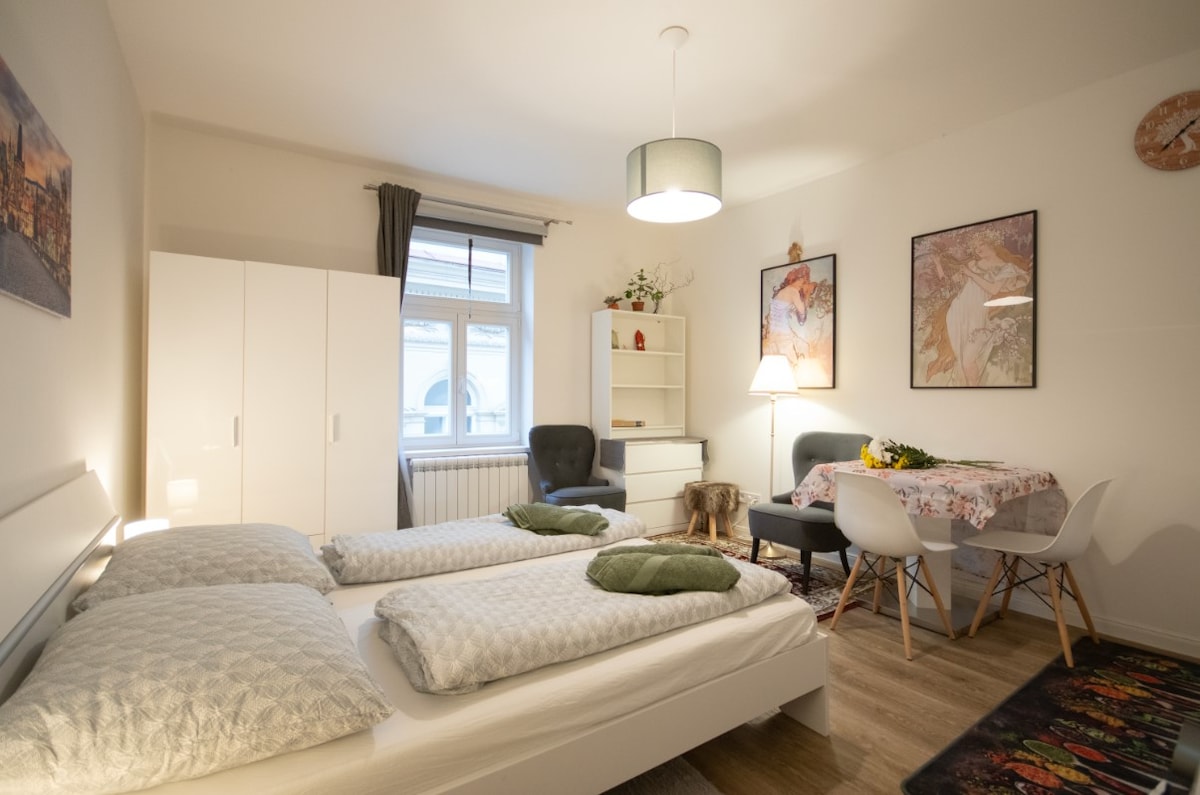 在豪華的床上醒來,享受浪漫的蚊帳和燈光。公寓由布魯內蒂( Brunetti )設計,他是布拉格著名的設計師,擁有精美的家具和醒目的鏡子。 私人陽台面向內院。 2024 年推出的全新矯形床墊,配有記憶泡綿,讓您享受最佳睡眠:) 這個很棒的街區讓您在靠近歷史中心的同時也能享受當地生活。
