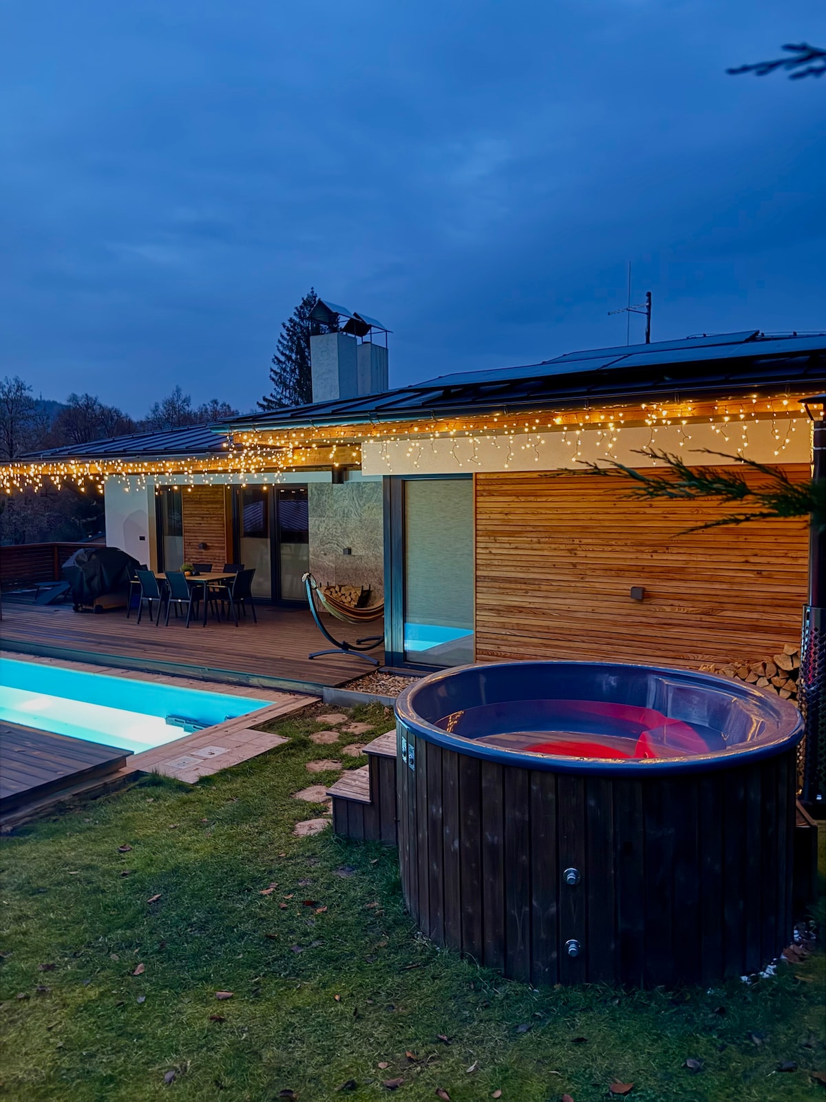 在現代化的空調小屋中🍀放鬆身心,配有露台,配有放鬆家具、豪華按摩浴池(每天60分鐘免費)或泳池(僅在夏季)、吊床、壁爐旁、配有餐桌家具的生物氣候涼亭,在美麗的1600平方米花園中燒烤,孩子們將享受一個大型兒童遊樂場。 你與🫶我們的家庭共用泳池和花園,我們的房屋和Airbnb小屋毗鄰 ❤️ 適合情侶、家庭和愛狗人士 布拉格市中心- 20分鐘 Aquapalace Čestlice – 10分鐘 Westfield Chodov:20分鐘 動物園- 35分鐘