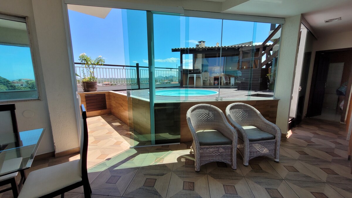 在這個獨特的地方度過難忘的時光! 我們的頂樓擁有適合家庭和朋友團體的休閒區,設有露天平台、私人泳池、木炭烤架和烤披薩爐。除了這個戶外區域外,該物業還有兩間套房、一個盥洗室、一個與廚房相連的客廳,以及一些Ipiranga和Praia de Pelotas海灘的美景。