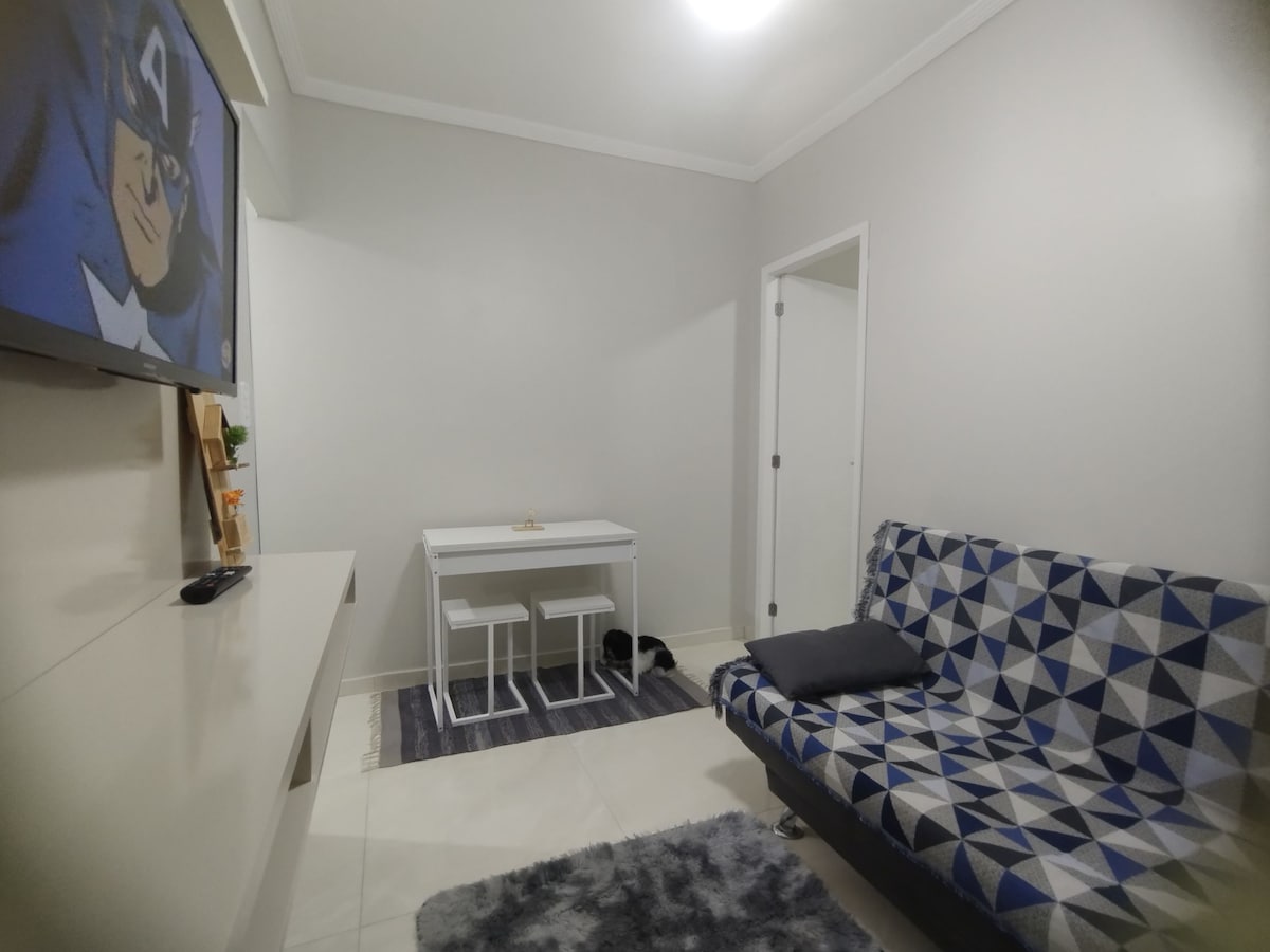 位於SP南海岸Praia Grande的最佳街區,距離海灘僅2個街區( 200公尺)。 它有1間帶風扇的臥室和4張單人牀、帶風扇和1張單人牀的房間、完整廚房、浴室和帶燒烤的美食陽臺 大樓有24小時入口、1個有蓋車庫空間和一個遊戲室可供房客使用。最多: 5人。 有WiFi。