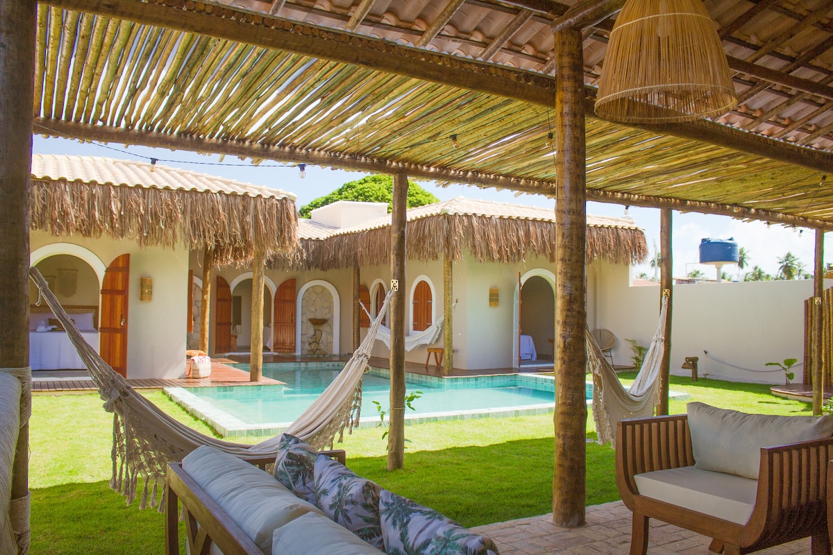 位於封閉式公寓內- AREIA的奇蹟-魅力之家。 完全的安全和寧靜。 帶私人泳池的豪華平房。 非常適合度蜜月或想要良好品味和隱私的人。 位於Praia do Toque海邊,這是São Miguel dos Milagres最好的海灘。 鄰近美味餐廳。 Jangadeiro在房子前面抓住他們,帶您步行前往該地區的天然泳池。 我們提供早餐