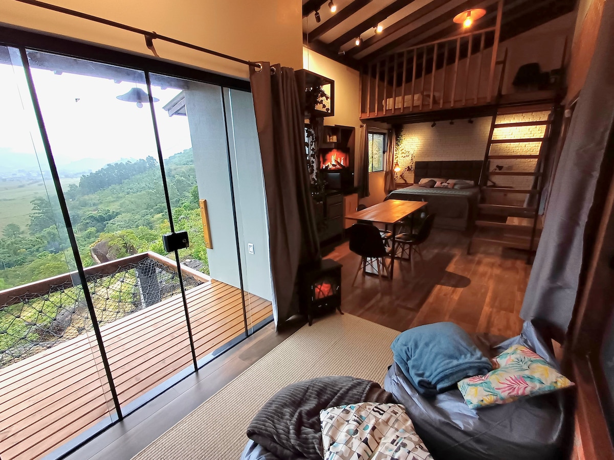 Um refúgio em meio a natureza com vista de tirar o fôlego , local tranquilo e seguro. #conheca também nossa outra hospedagem pelo link: airbnb.com/h/cabanagaropaba02 Equipado com: Banheira aquecida imersão Aquecedor externo a gás Wi-fii (fibra ótica) Smart Tv 32" Lareira elétrica Cozinha equipada Ar condicionado Churrasqueira Chuveiro à gás 1cama queen ,2camas solteiro Acesso super tranquilo com 1km de estrada de chão.