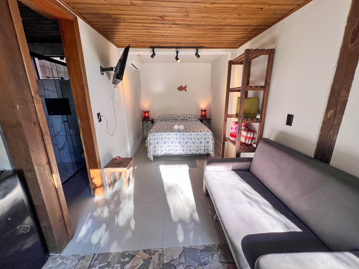 套房配有雙人床、床上用品、冷氣、50英寸電視、衣櫃、桌子、椅子和大浴室,浴室配有淋浴間、洗手盆和馬桶。 它有微波爐、咖啡機、電熱水壺、迷你吧,以及碗碟和餐具,可供快速用餐。 沒有爐具。它有1輛小車的泊車位。 位置: -在centrinho do Rosa的主要街道上 -距離Praia do Rosa 1.3公里 -距離Praia do Ouvidor 3.4公里 -距離加羅帕巴市中心15公里 -距離Praia da Ferrugem 17公裏