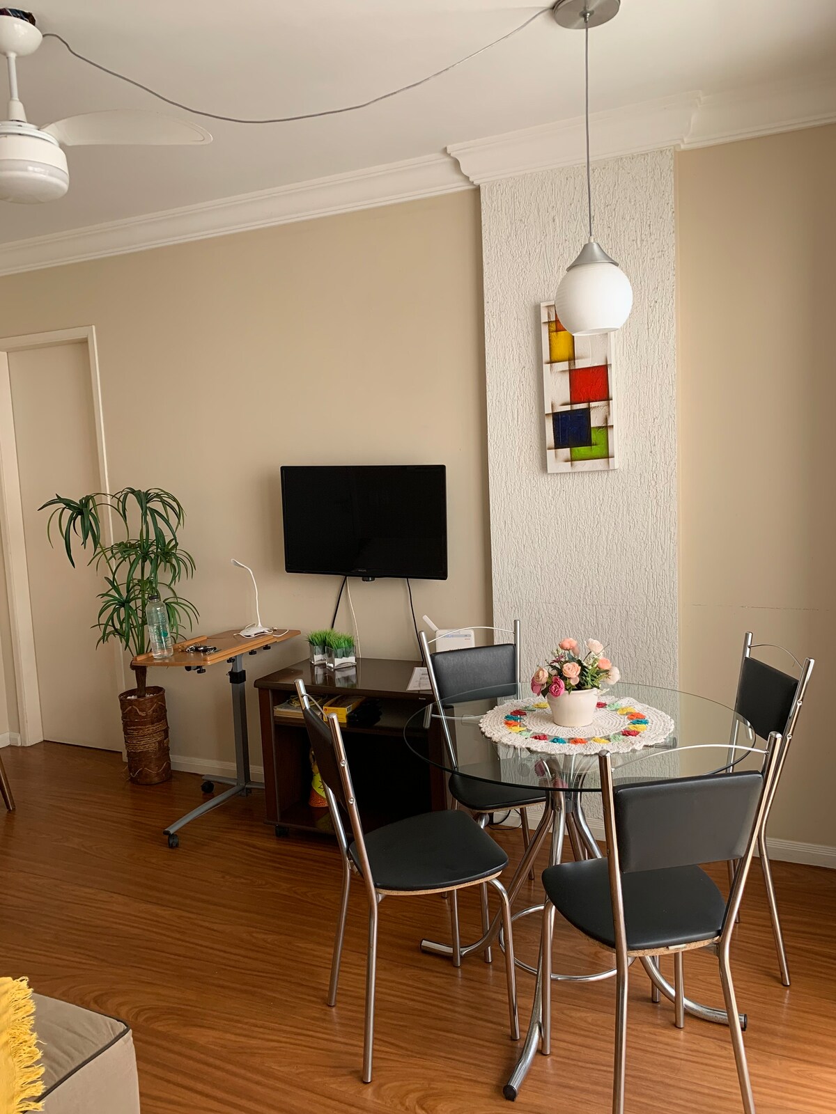 位於瓜拉帕里市中心的Antenor Perim大樓,面向卡斯塔尼亞斯海灘和步行街(公寓可俯瞰情人海灘)。海灘很安靜,非常適合兒童。距離黑沙海灘100公尺。靠近餐廳、健身房、公共交通、市集、手工藝品、超市、購物中心、麵包店。您會因為地理位置、環境和街區而喜歡我的空間。非常適合有小孩的家庭(因為陽臺和臥室窗戶上有安全網)。