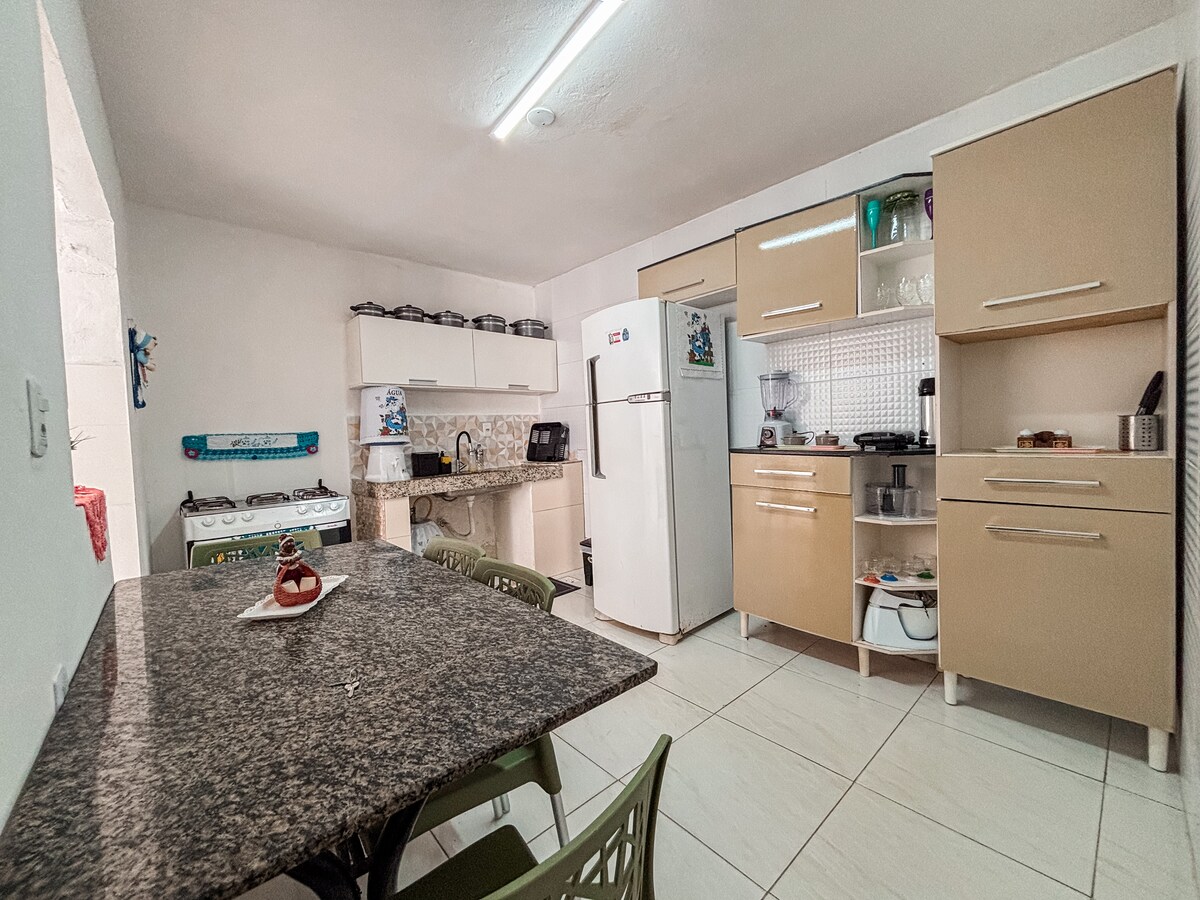 我們的房子距離機場1公裏,距離Atalaia海濱1.5公裏! 我們的街區很安靜,沒有搶劫費用! 您可以在房源內使用: -完整廚房和免費WiFi -客廳配有沙發、電視、吊扇 1間臥室,配有1張雙人牀和1張單人牀、空調和吊扇,均配有遙控器 -可供第4位房客使用的額外單人牀墊 -配備洗衣機的服務區域 注意:第4位房東將在單人牀墊上