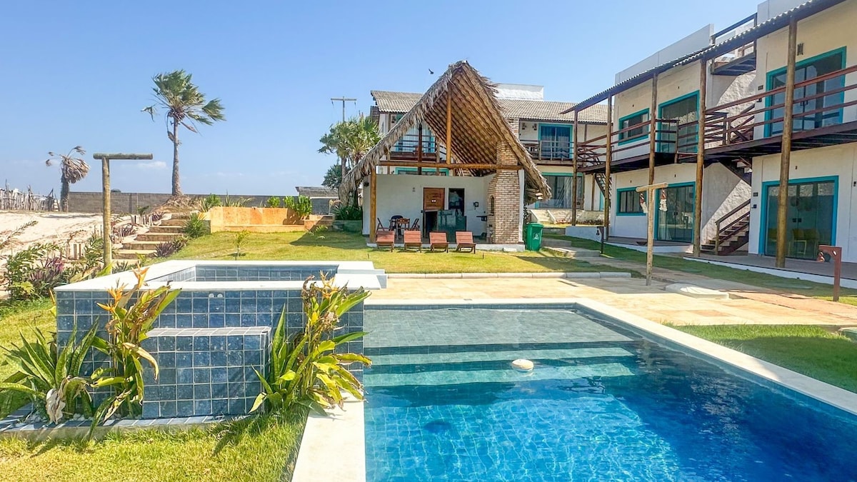這間套房位於海灘上,有自己的廚房、戶外烤架和私人戶外區域,還有一張餐桌。 通往海灘和遊泳池的私人通道。 套房就在套房上,因為有4張牀,也非常適合家庭或4人團體。 步行5分鐘即可抵達Barra Grande市中心。 套房旁邊100米是Beach Bar Trabalha Brasil沙灘酒吧,海灘別墅的客人就在沙灘旁邊享用早餐。