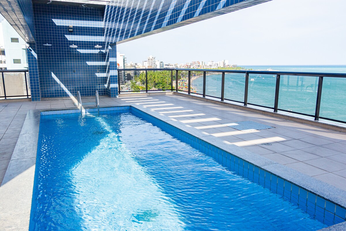 新建築,配有3部電梯,24小時接待服務,位於Pajuçara海灘前,毗鄰超市、藥店、電子商店、餐廳、手工藝品市場、前往阿拉戈斯海灘(Maragogi、Gunga、Francês、Porto de Galinhas)的小巴出發點、軍警小屋,並有一個可俯瞰海灘的屋頂,配有游泳池和燒烤區。公寓每週提供3次清潔服務(表面清潔)(請在接待處預約)。