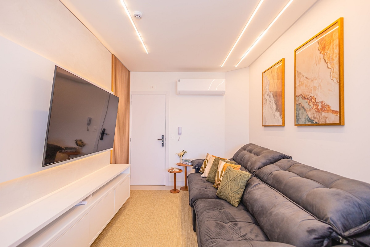 Lindo apto finamente mobiliado, totalmente climatizado. Possui 75m² com varanda fechada e vista lateral mar. Suíte com cama queen mais um dormitório com cama de casal, ambos com Smart TV. Cozinha, sala e sacada com churrasqueira integrados em conceito aberto. A cozinha é equipada com móveis planejados, fogão, forno elétrico, geladeira e microondas, além dos demais utensílios. Lavanderia com lavadora e secadora à disposição.