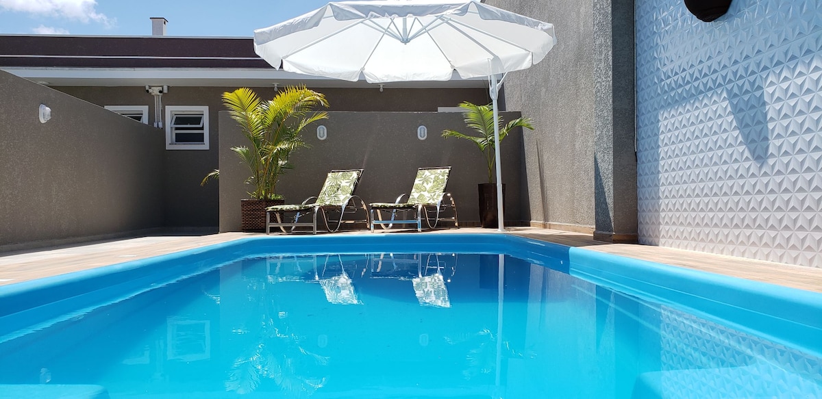 Viva dias incríveis em Guaratuba! Nossa casa moderna oferece total privacidade a apenas 3 min de carro da praia. Perfeita para até 9 pessoas, conta com 2 suítes, ar-condicionado e mezanino para jovens. Destaques: • Piscina privativa com iluminação noturna. • Área Gourmet completa com churrasqueira e cervejeira. • Wi-Fi rápido e 3 vagas de garagem. • Kit bebê: Disponibilizamos berço e cadeirão. Localizada no seguro bairro Cohapar, é o refúgio ideal para famílias que buscam conforto e lazer! 🌊