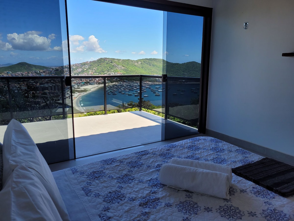 Relaxe neste lugar único e tranquilo. Rua pequena e sossegada, pequena subida de paralelepípedo, Villa Magrini no googlemaps ou Uber. Otima localização com uma vista linda. Suite com espaço gourmet, churrasqueira e fogão de uso exclusivo. 300 metros da praia de tucuns, 1km da praia de Geribá. 2 km do mais lindo Por do sol de Buzios: Porto da Barra (onde se encontra o melhor da Gastronomia buziana) e 8 minutos Rua das Pedras. Vista para o por do sol.